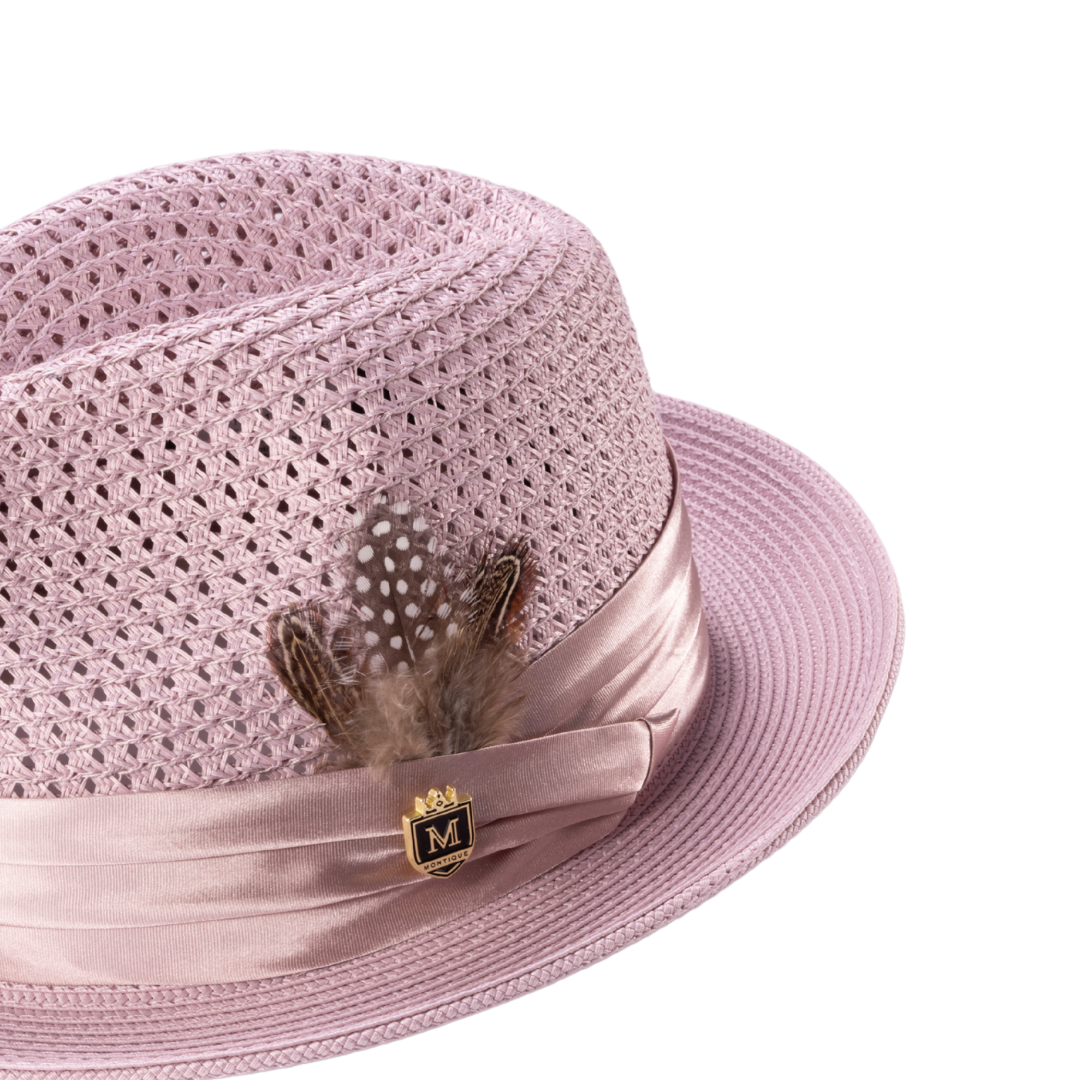 Be daring and fearless this summer in the Montique's Mauve Solid Color Pinch Braided Fedora with matching satin ribbon. Perfectly airy for hot summer days, this stylish fedora is outfitted with a feather accent and Montique Pin. Show off your daring personality and challenge the heat in style with the Polyester Blend material and 2" brim size.