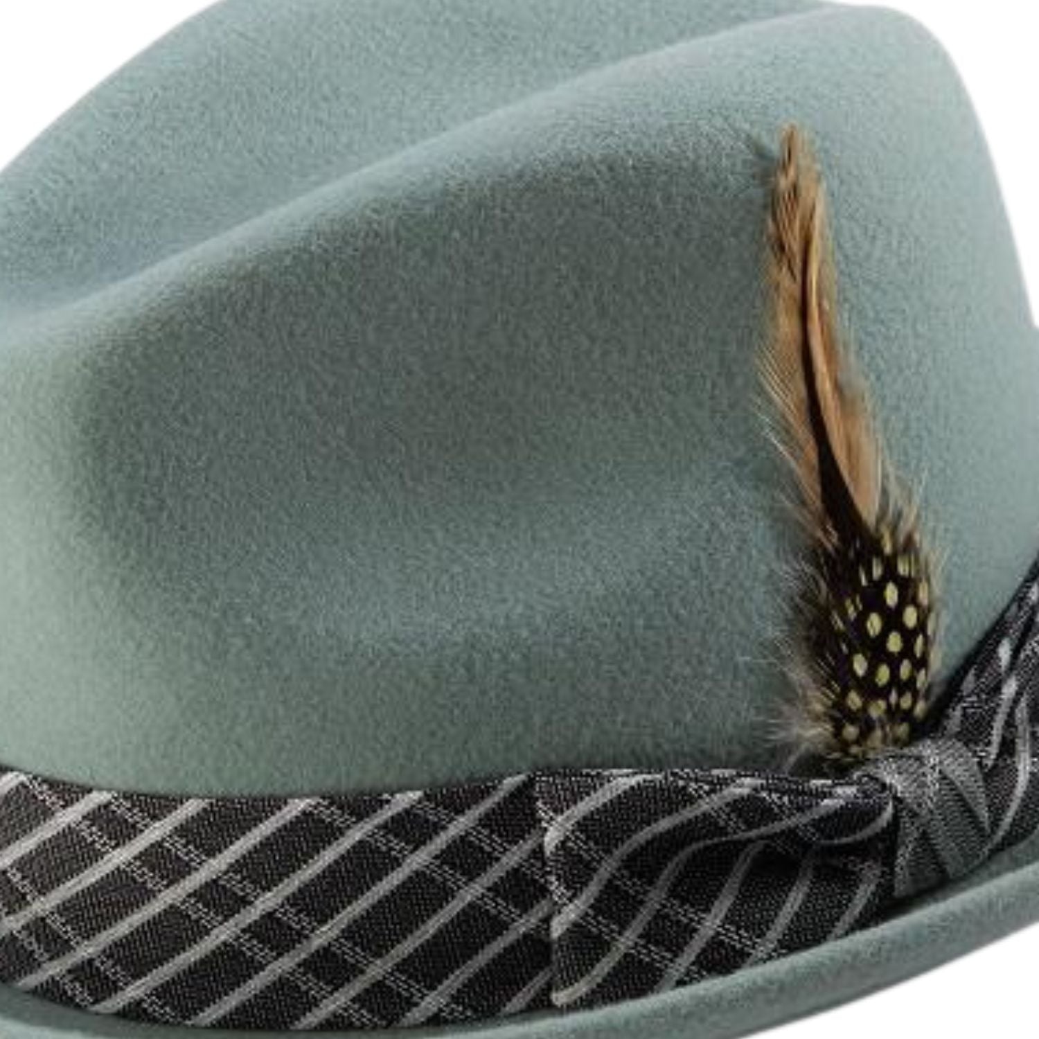 This fedora features a 2 1/4 inch brim with a structured shape that keeps the profile clean and easy to wear. The crown is formed for a classic silhouette, while the band and feather accent add contrast without overcomplicating the design.
