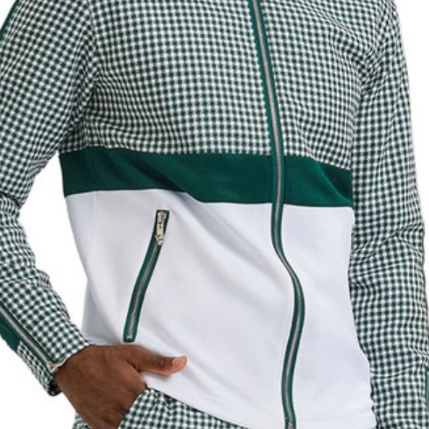 Elevate your style with our Green Two Tone Houndstooth Sports Suit. This fashionable ensemble includes a jacket and pants, perfect for a sharp and modern look. The jacket features houndstooth plaid with a striped bottom, fully constructed design, zipper closure, and convenient side pockets. The matching pants boast the same houndstooth pattern, a skinny fit, side stripes, and a flat front for a sleek appearance.