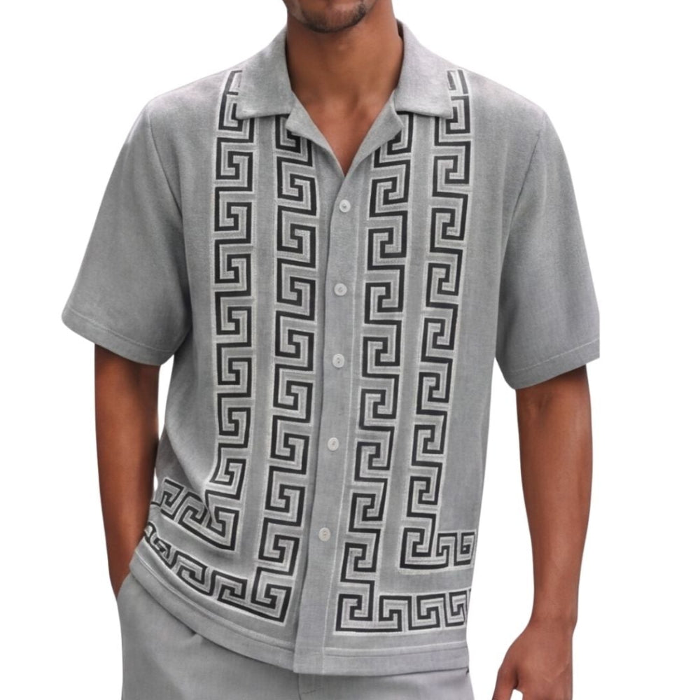 Part of the Crestview Collection, this 2-piece walking suit set includes a short sleeve button-front shirt with a Greek key knit front and matching solid pants. The front panel adds strong visual structure through repeated geometric framing, while the coordinated pants keep the set balanced and easy to wear.