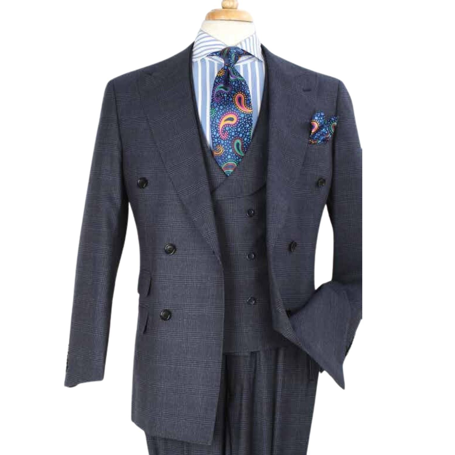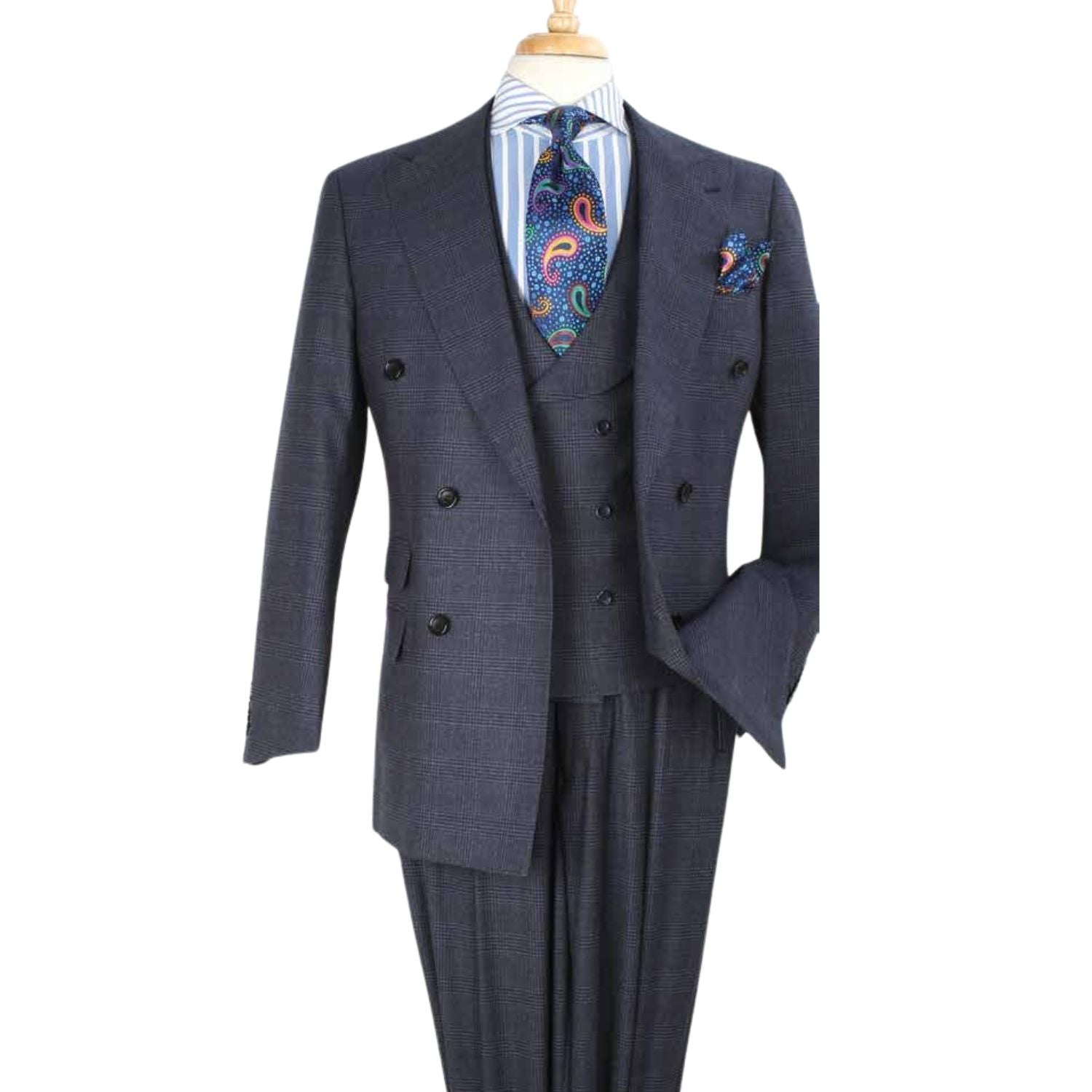 Grey Windowpane 100% Wool High Fashion Three-Piece Suit with Vest