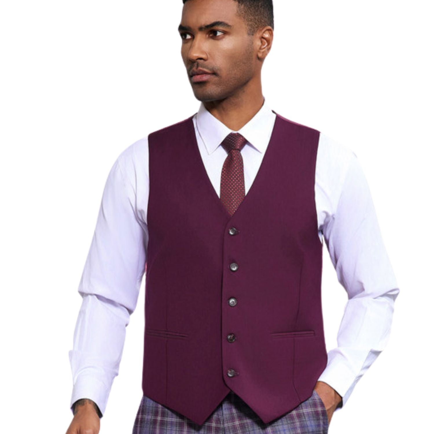 A statement of refinement, the Heliotail Collection blends classic plaid with a hybrid fit, offering a tailored yet comfortable silhouette. This three-piece suit in a rich wine and grey plaid design is a standout choice for distinguished styling, perfect for formal and upscale casual settings.