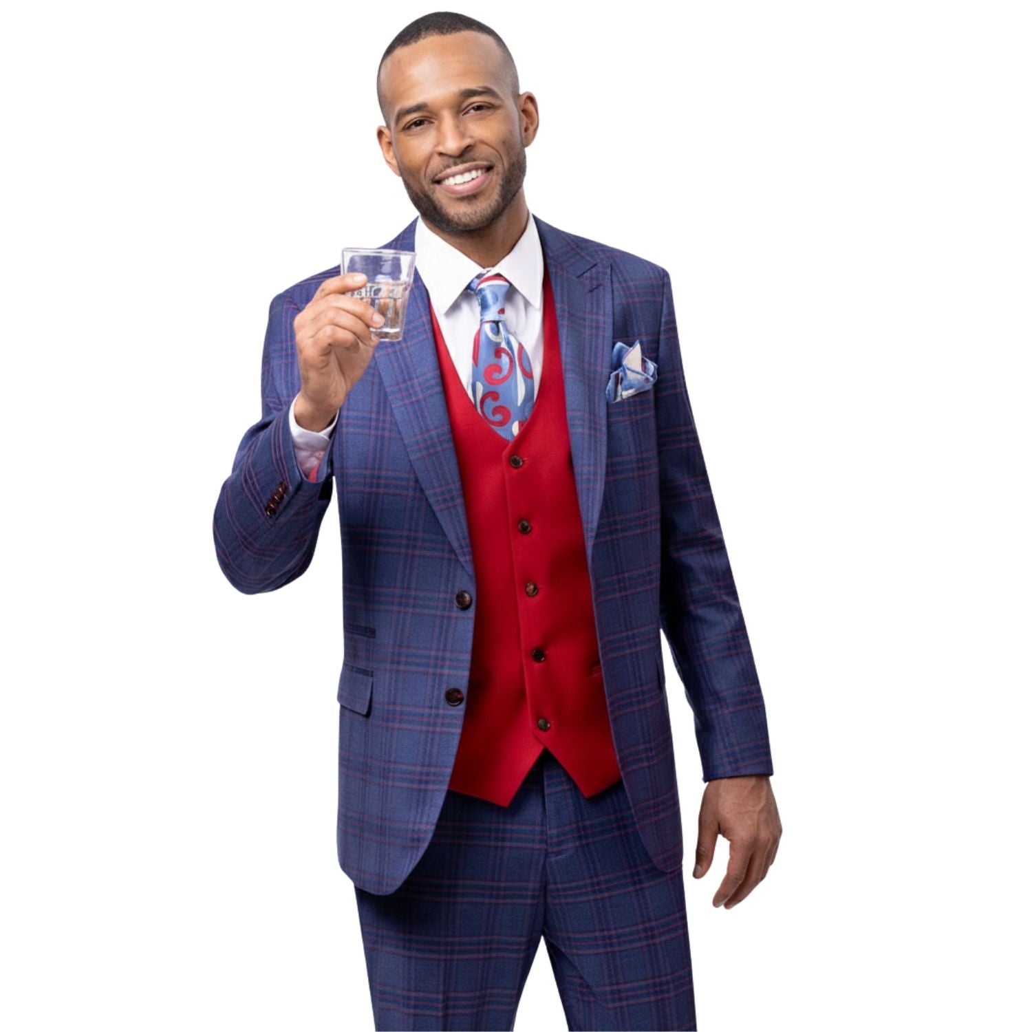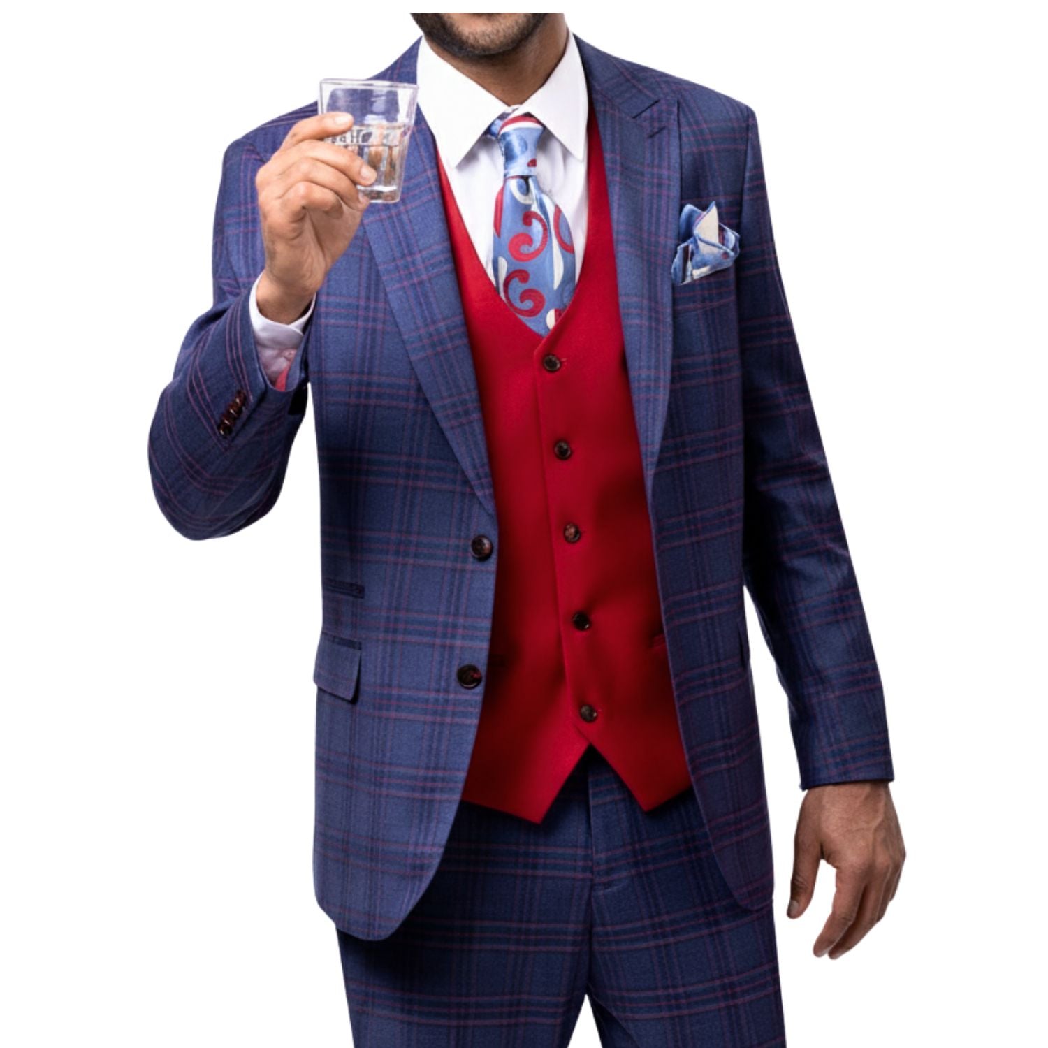 Hera Collection: Navy & Red 3-Piece Plaid Fashion Suit with Matching Red Vest