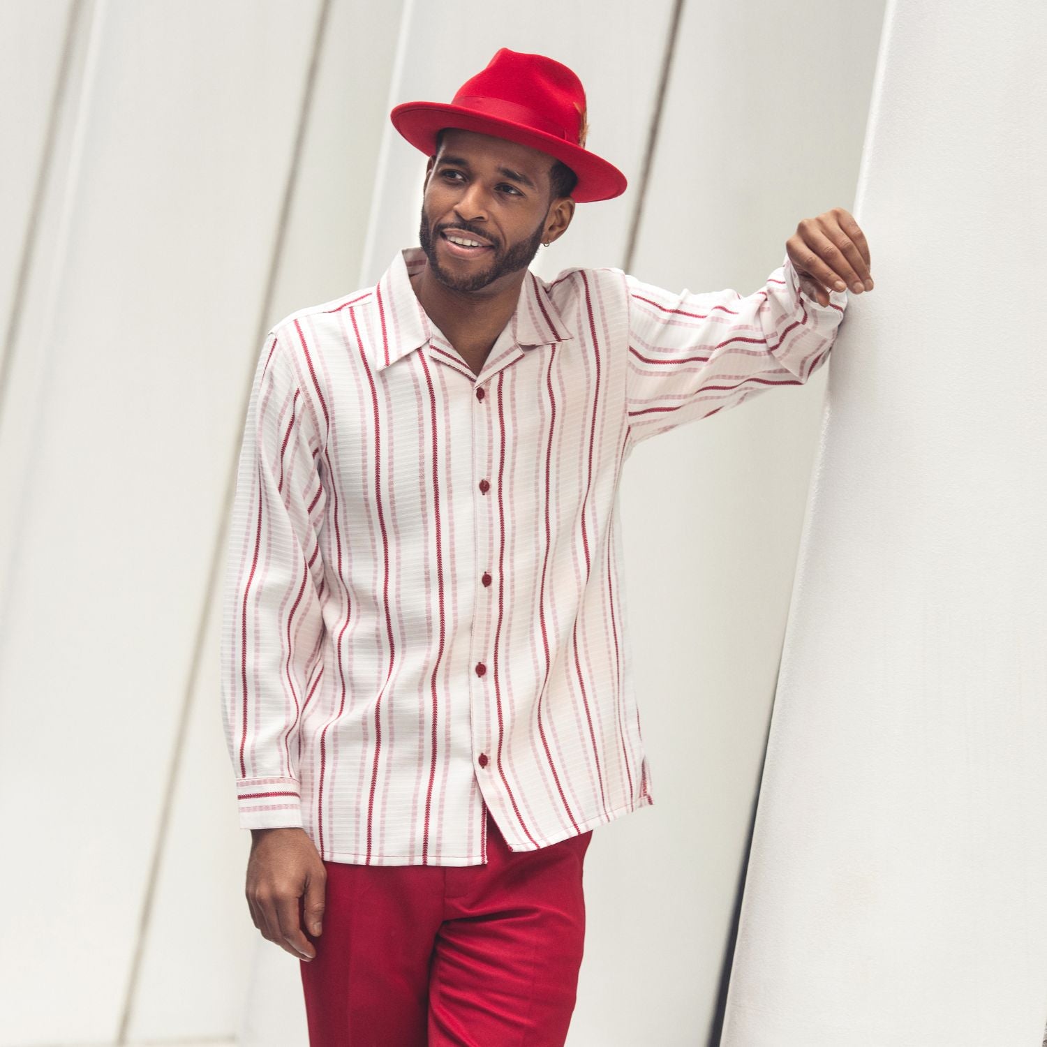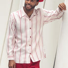 Two-piece set with a long sleeve shirt in vertical red stripes on a white ground and solid matching red pants. Shirt has an open collar and button front. Regular fit.