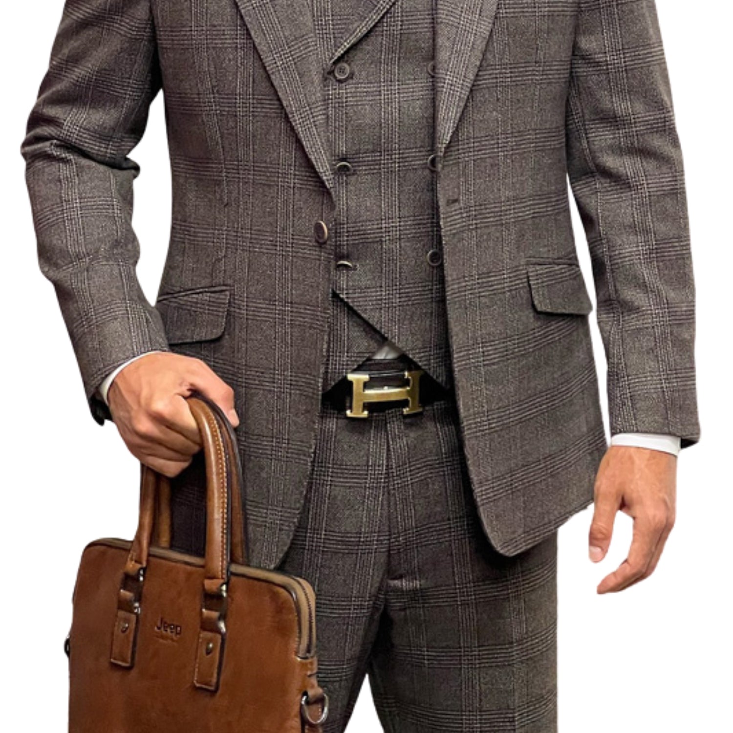 - Jacket: Single-breasted 1-button peak lapel design, adorned with a unique brown tweed plaid.