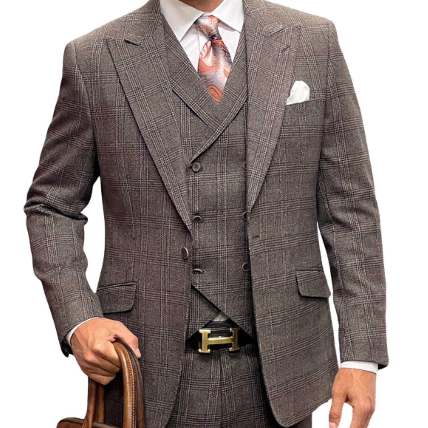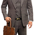 Hugo Highness Collection: Brown Tweed Self Plaid 3-Piece Suit with Double-Breasted Vest - Modern Fit
