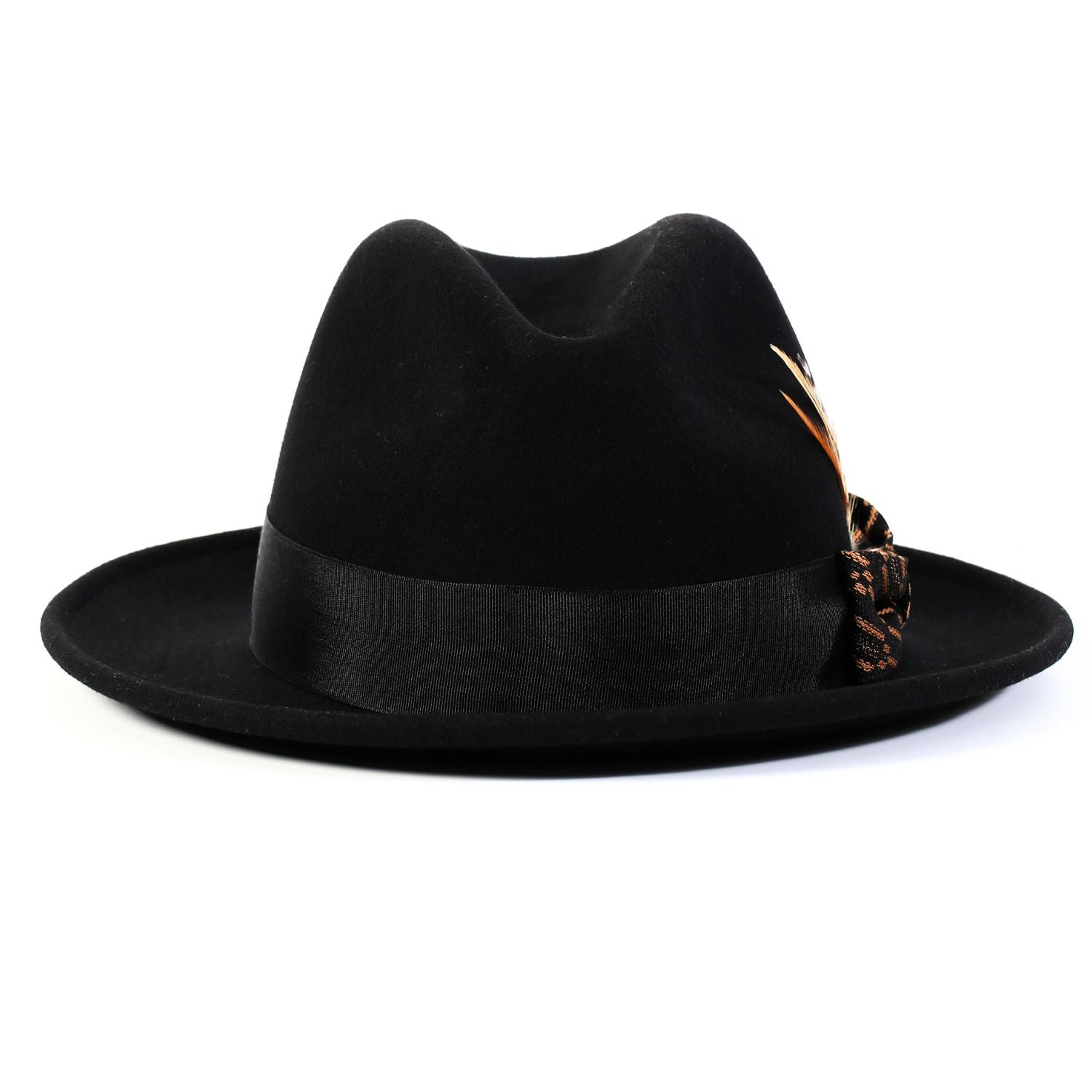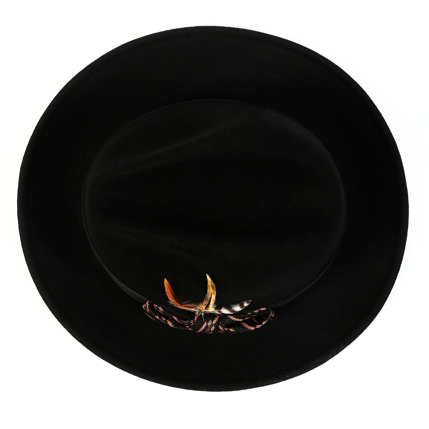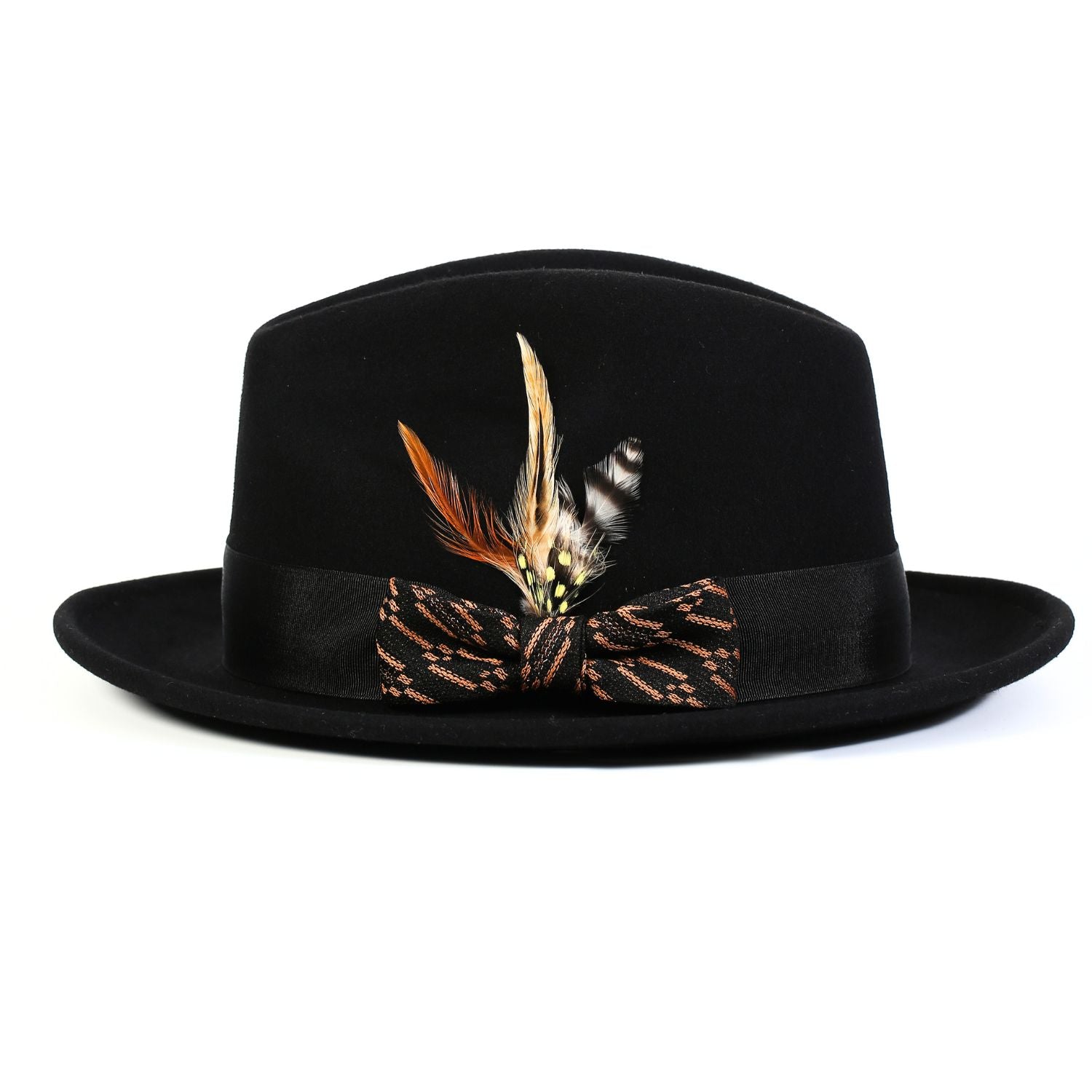 Discover the epitome of elegance with our Men's Black/ Cognac Wool Fedora Hat from the Imperialis Collection. This stylish accessory is meticulously crafted from the finest wool, offering both comfort and durability. It features a sleek black design that is both versatile and timeless. The hat is adorned with a vibrant feather and a black band with cognac bow, providing a splash of color and sophistication that makes it stand out in any ensemble.