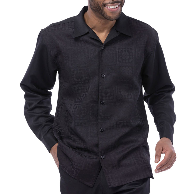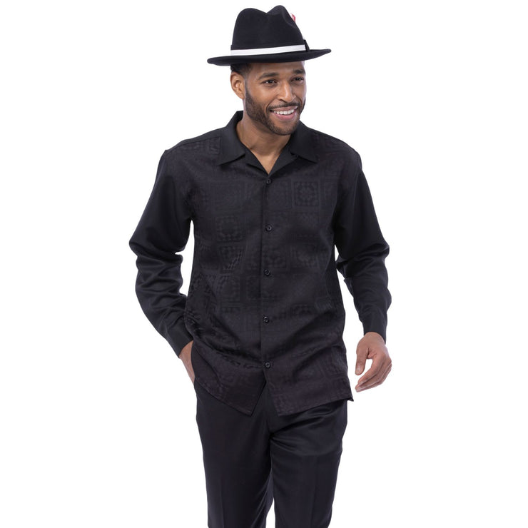 Montique's 2-piece walking suit includes a black long sleeve shirt with a woven geometric tile pattern across the front and a pair of matching solid black flat-front pants. The shirt features an open collar and button-down front. Lightweight and breathable, ideal for year-round wear.