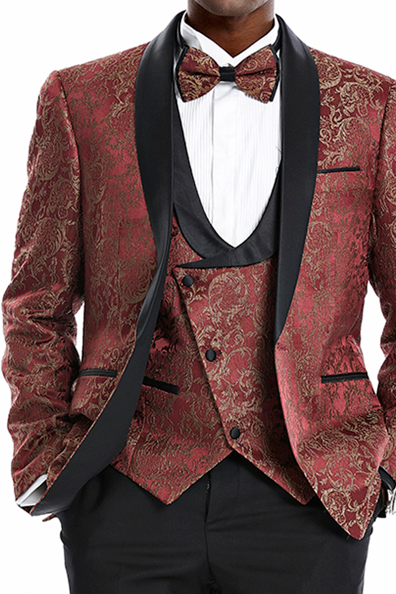 The jacket, adorned with a solid shawl collar, provides a striking contrast against the rust paisley backdrop, featuring a one-button front closure and two side slit pockets for a blend of functionality and fashion. Accompanied by a matching rust paisley, solid textured, double-breasted vest with a three-button closure, this suit set exudes elegance and refinement. Completing the ensemble, the solid skinny fit pants in a harmonious rust/black hue ensure a cohesive and polished look.