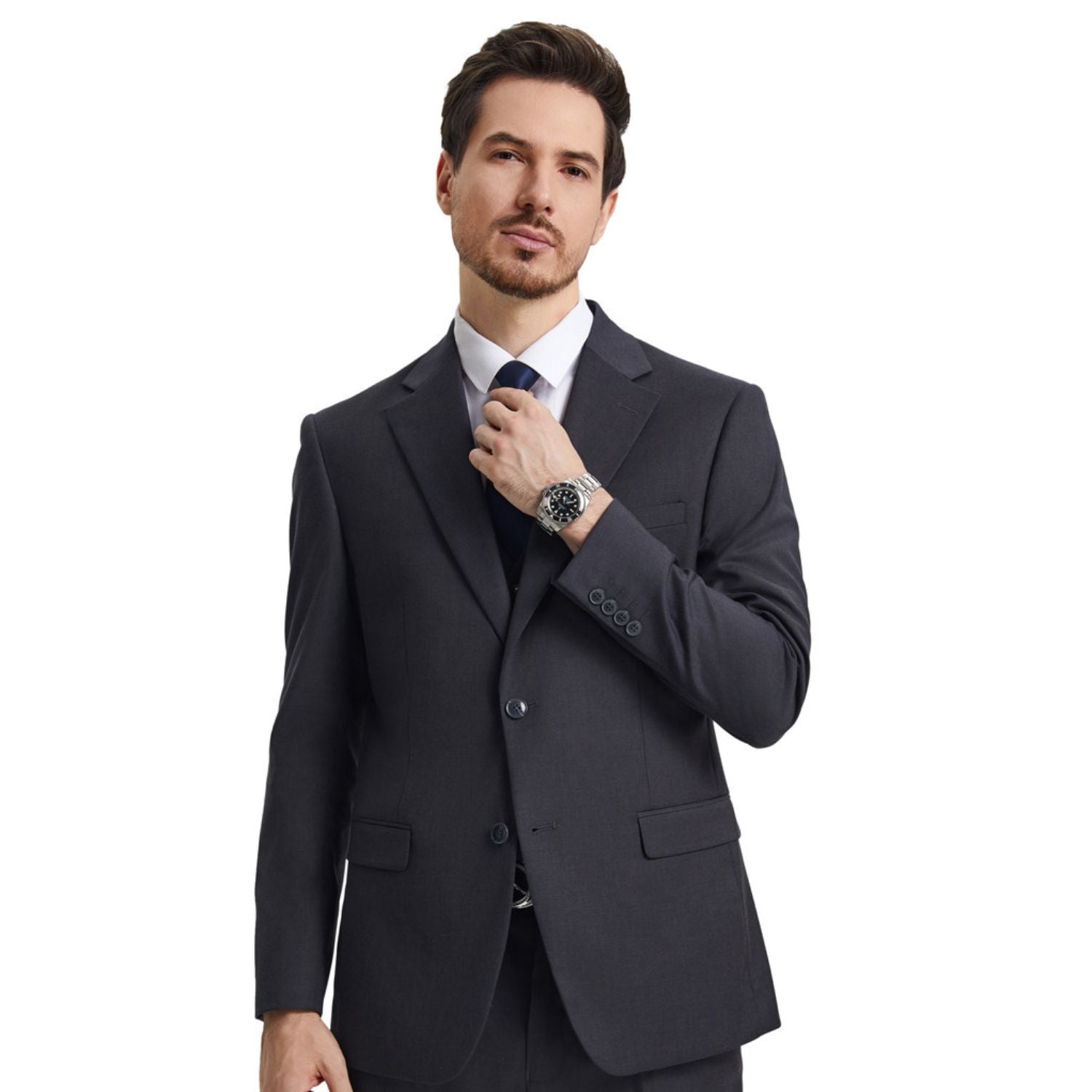 Part of the Kepler Collection, this Charcoal three-piece suit from Stacy Adams is designed for sharp, modern style with a hybrid fit. Featuring a structured notch lapel, side vents, and a sleek silhouette, it blends timeless elegance with contemporary tailoring. Perfect for formal occasions and refined everyday wear.