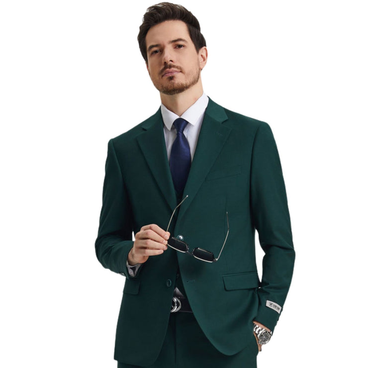 Part of the Kepler Collection, this Green three-piece suit from Stacy Adams is designed for sharp, modern style with a hybrid fit. Featuring a structured notch lapel, side vents, and a sleek silhouette, it blends timeless elegance with contemporary tailoring. Perfect for formal occasions and refined everyday wear.