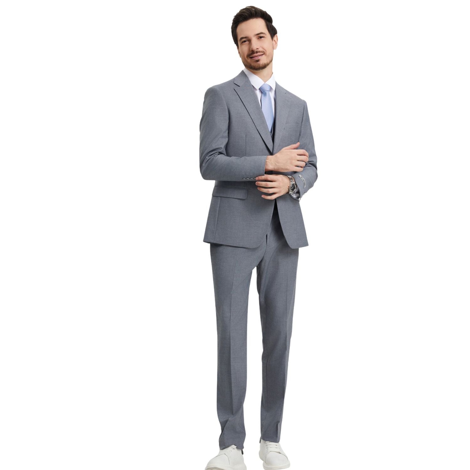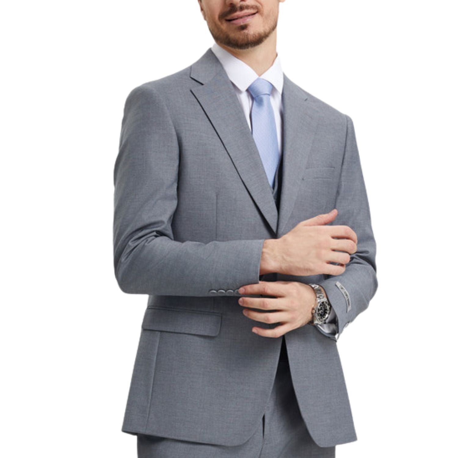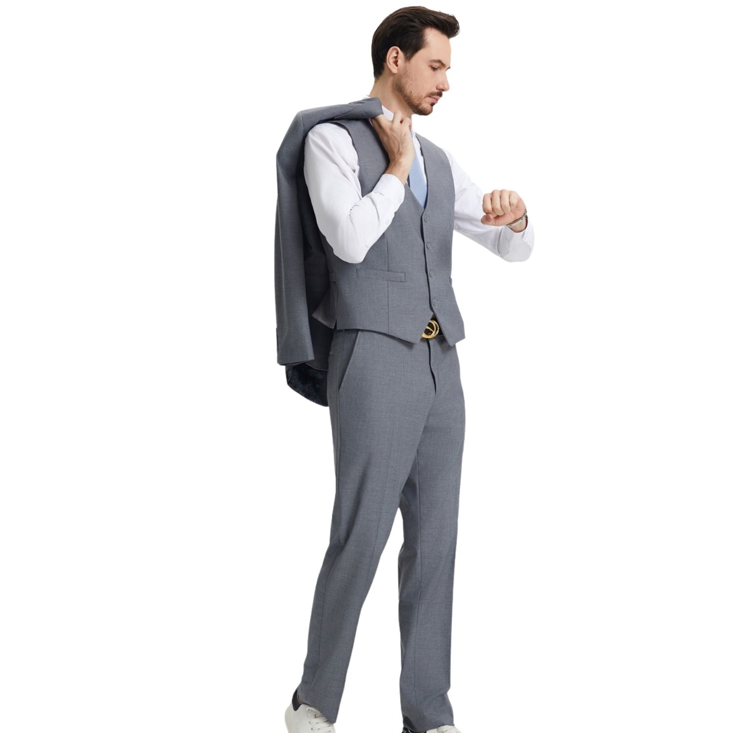 Part of the Kepler Collection, this Medium Grey three-piece suit from Stacy Adams is designed for sharp, modern style with a hybrid fit. Featuring a structured notch lapel, side vents, and a sleek silhouette, it blends timeless elegance with contemporary tailoring. Perfect for formal occasions and refined everyday wear.