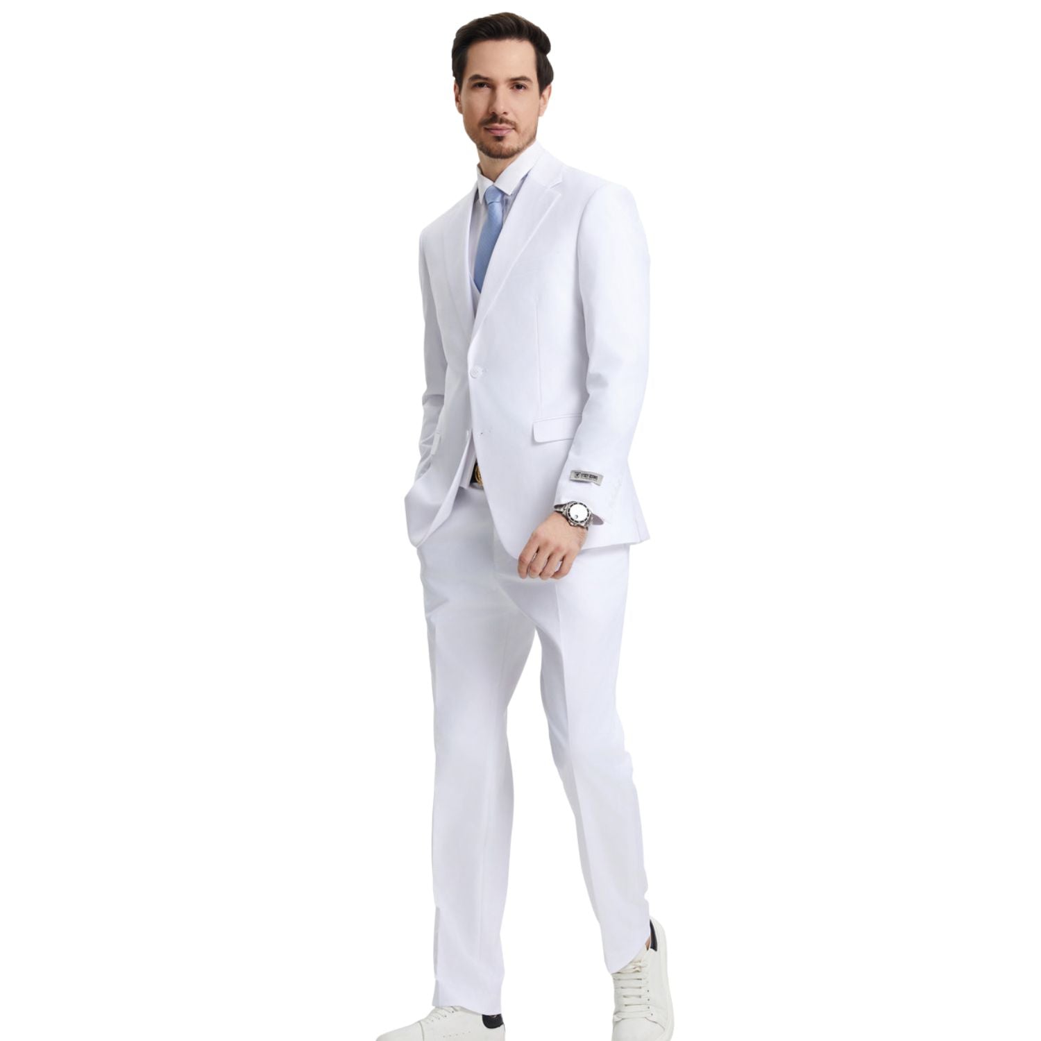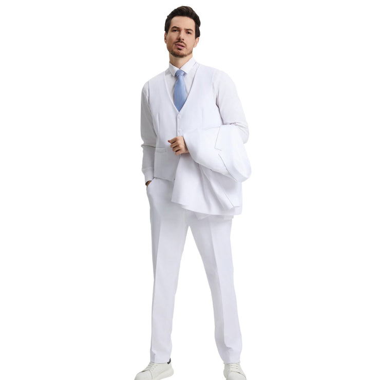 Part of the Kepler Collection, this White three-piece suit from Stacy Adams is designed for sharp, modern style with a hybrid fit. Featuring a structured notch lapel, side vents, and a sleek silhouette, it blends timeless elegance with contemporary tailoring. Perfect for formal occasions and refined everyday wear.