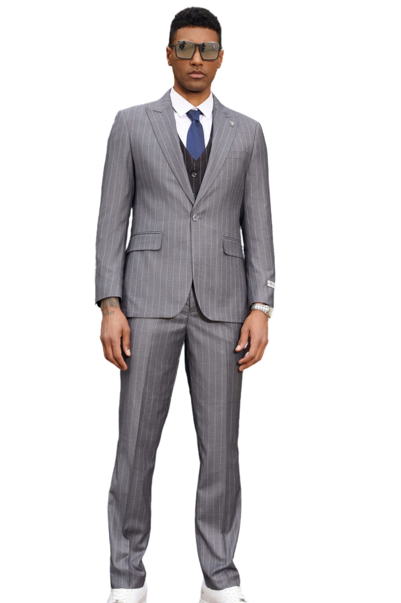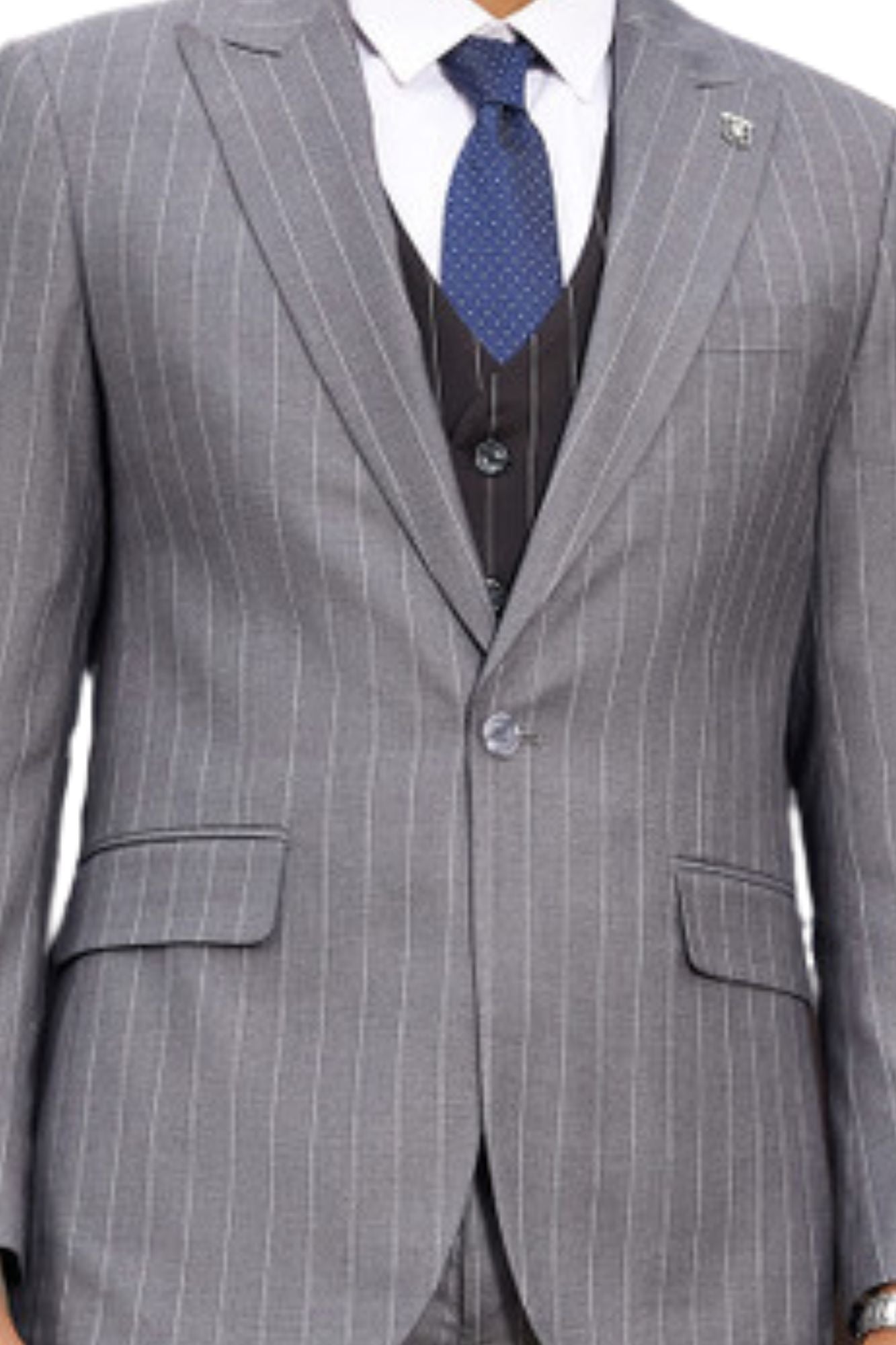 Lavellaby Collection: 3 Piece Men's Pinstripe Hybrid Fit Suit In Steel Grey