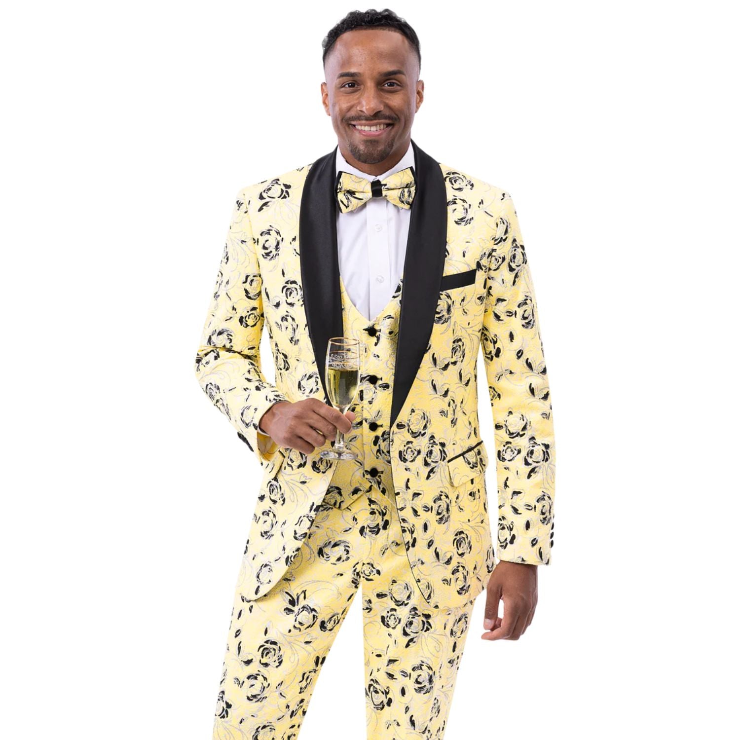 Lazuli Bloom Yellow 3-Piece Floral Print Fashion Suit with Matching Bowtie