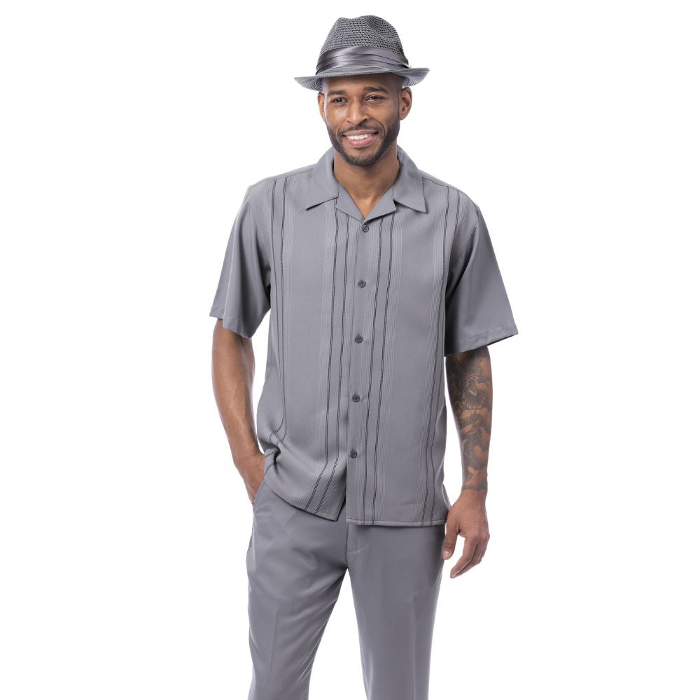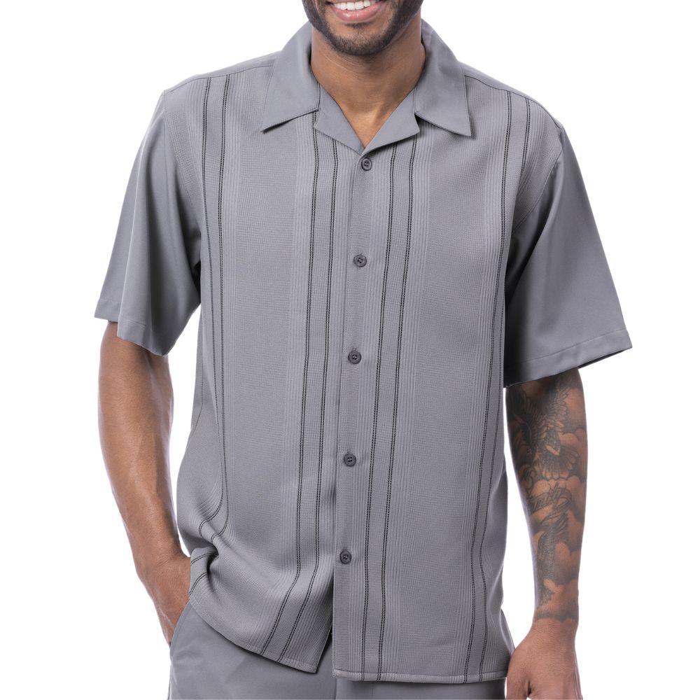 Lineweight Collection: Montique Men's Grey 2-Piece Textured Vertical Line Panel Short Sleeve Set