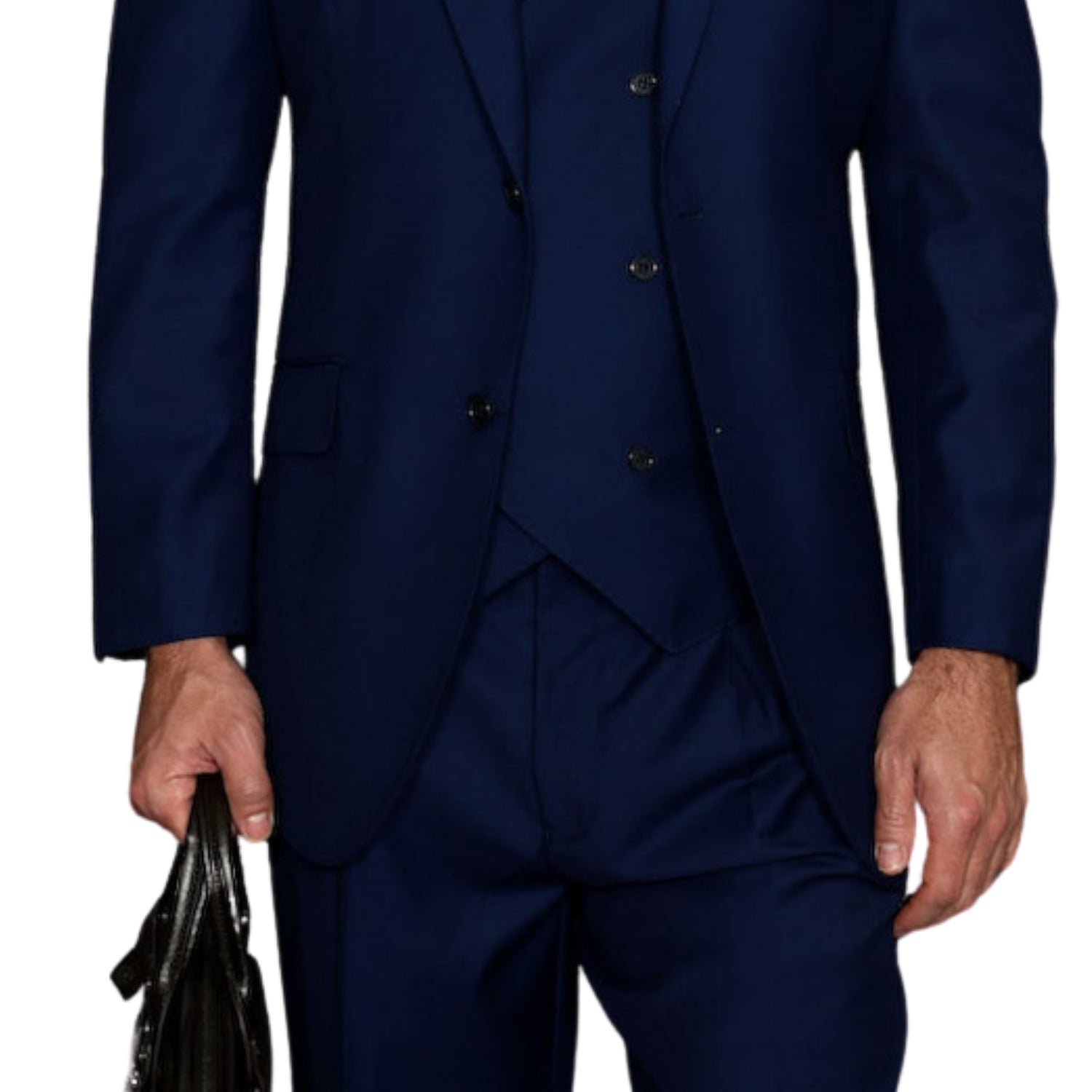 Introducing the LunarLuxe Sapphire 3-Piece Suit, an epitome of sartorial elegance, crafted from Super 150's Italian wool for a touch of luxury. This suit features a sapphire hue that exudes professionalism and sophistication. The jacket is designed with precision, featuring hand stitches on the lapel and front, complemented by two practical back vents for enhanced mobility. The double-breasted vest amplifies the suit’s formal aesthetic, while the classic fit Pleated pants, lined to the knee, provide comfort and style, making this suit ideal for corporate events, weddings, or any formal occasion.