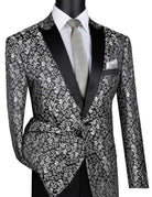 For a modern and sleek touch, the Luxnova Silver Jacquard Print Blazer delivers a stunning jacquard pattern with a sophisticated shawl lapel. The silver design exudes elegance and makes for an impeccable addition to any formal wardrobe.