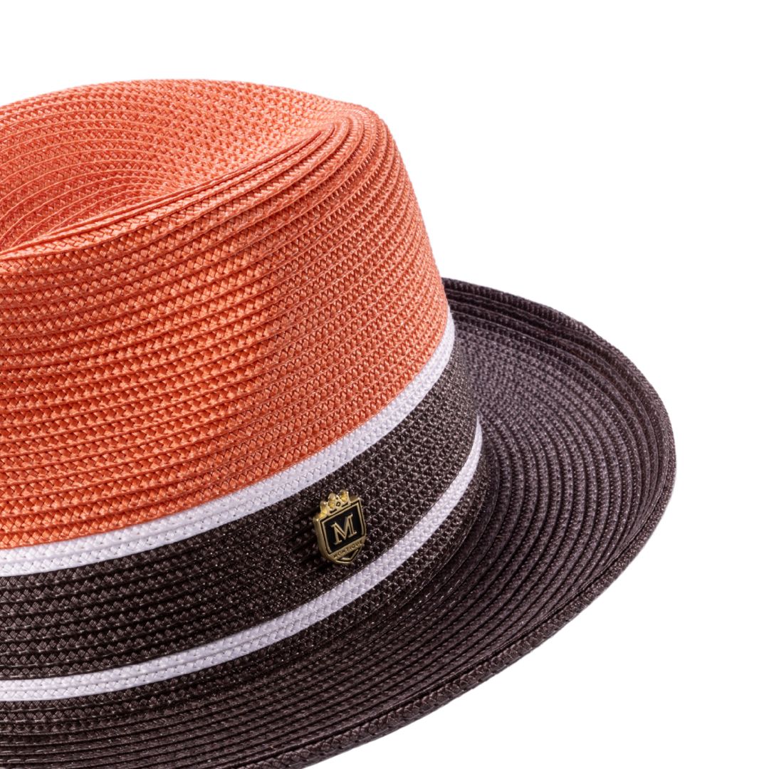 The Montique Luyten Collection brings a fresh take on classic headwear with this stylish three-tone fedora. The structured design features a bold orange crown that seamlessly transitions into a deep brown brim, accented by crisp white stripe detailing. This combination creates a striking contrast that adds character while maintaining a refined aesthetic. Made from durable yet breathable straw-like material, this hat is perfect for warm-weather occasions, whether you're stepping out for a casual gathering or adding flair to a dressier ensemble.