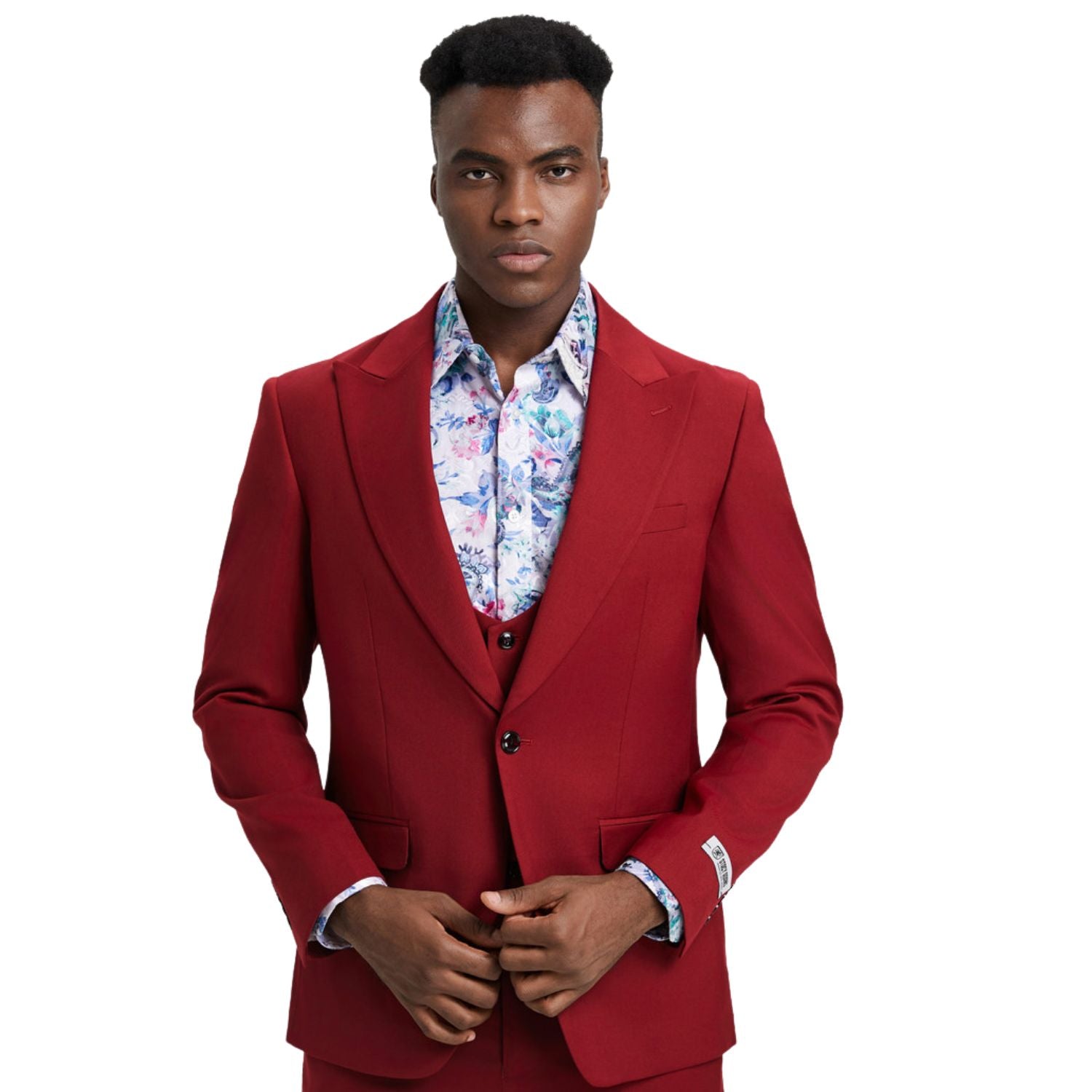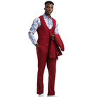 Designed for modern elegance, the Maroonyx Collection by Stacy Adams delivers a sleek, tailored look in a solid Cherry Red hybrid fit. This three-piece suit—jacket, vest, and pants—offers refined details and timeless versatility, making it ideal for both formal and stylish casual settings.