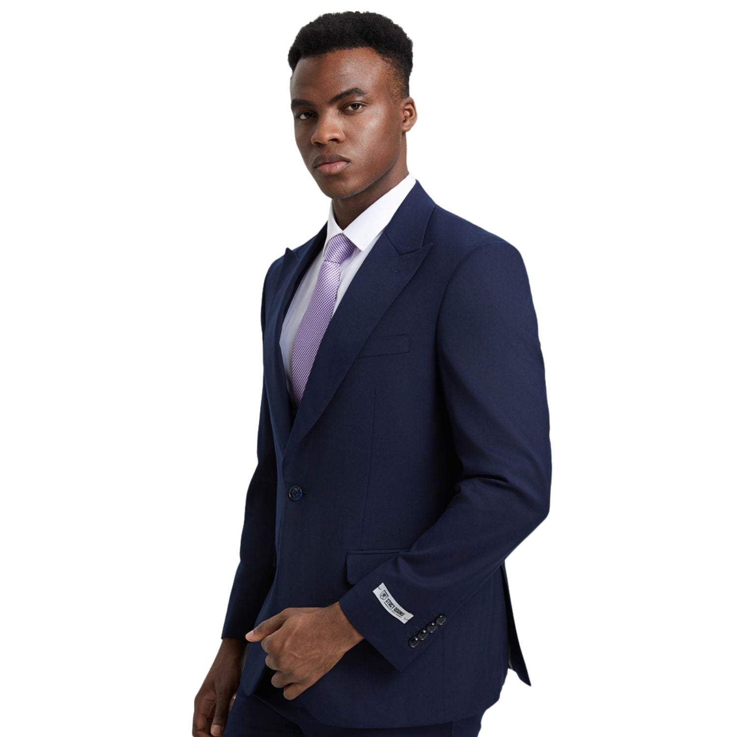 Designed for modern elegance, the Maroonyx Collection by Stacy Adams delivers a sleek, tailored look in a solid Navy Blue hybrid fit. This three-piece suit—jacket, vest, and pants—offers refined details and timeless versatility, making it ideal for both formal and stylish casual settings.
