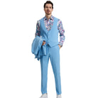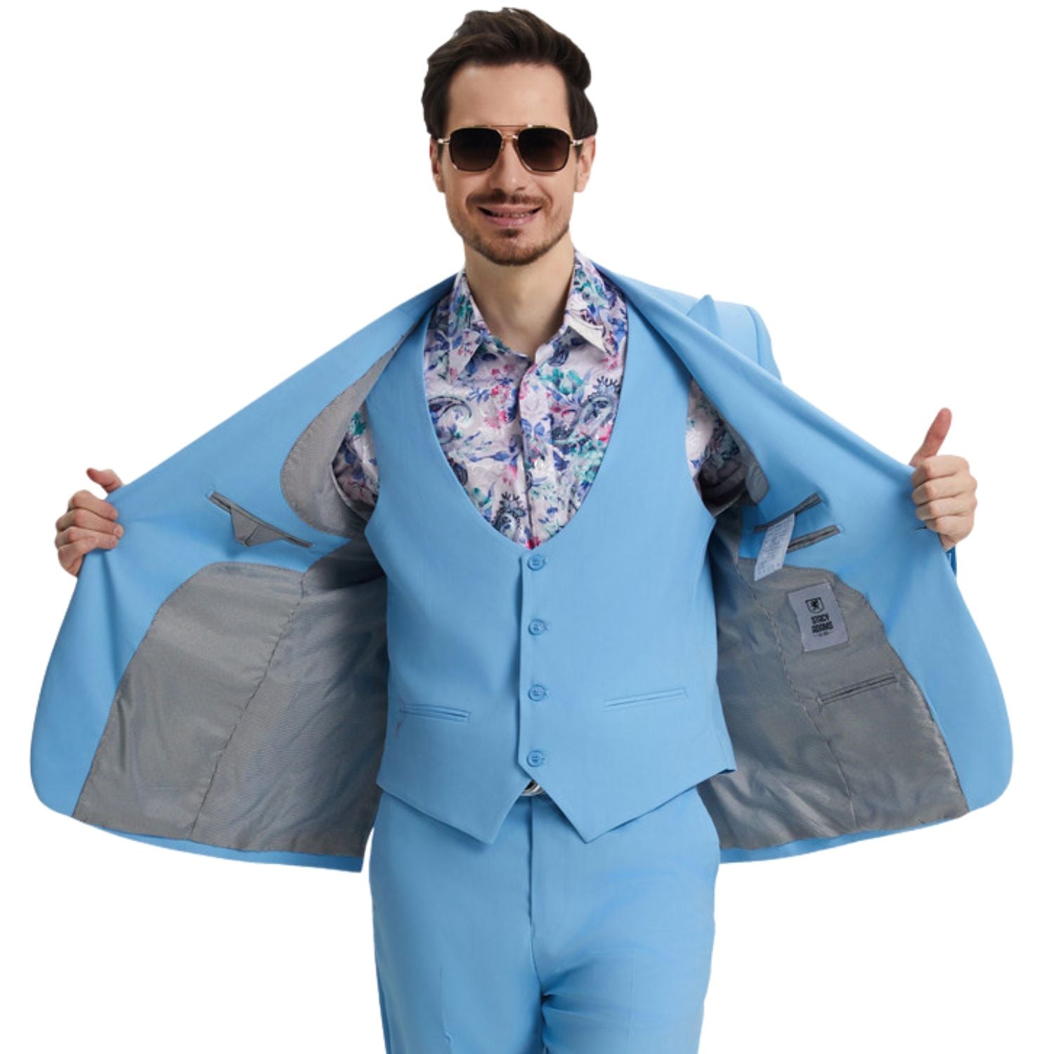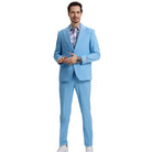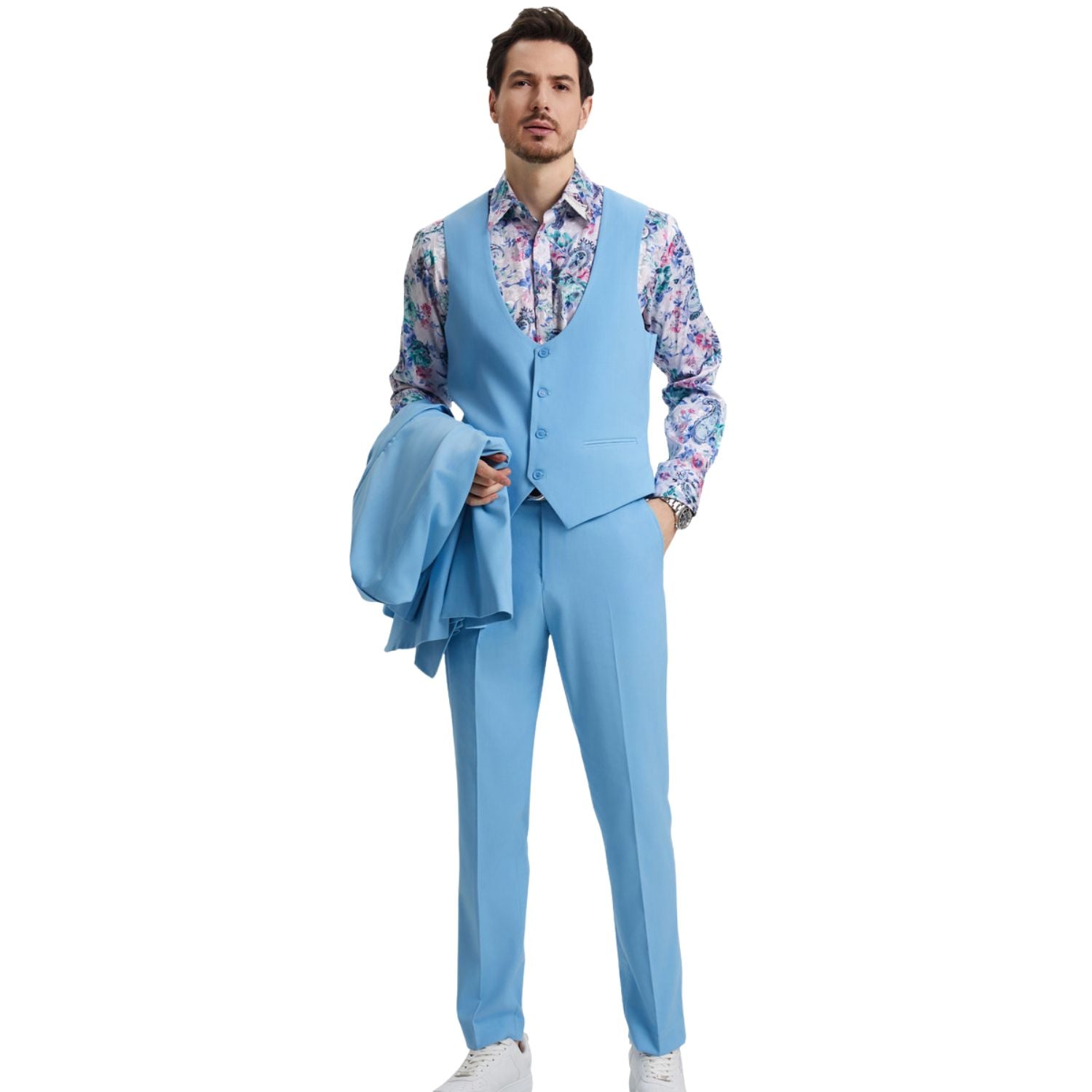 Designed for modern elegance, the Maroonyx Collection by Stacy Adams delivers a sleek, tailored look in a solid Sky Blue hybrid fit. This three-piece suit—jacket, vest, and pants—offers refined details and timeless versatility, making it ideal for both formal and stylish casual settings.