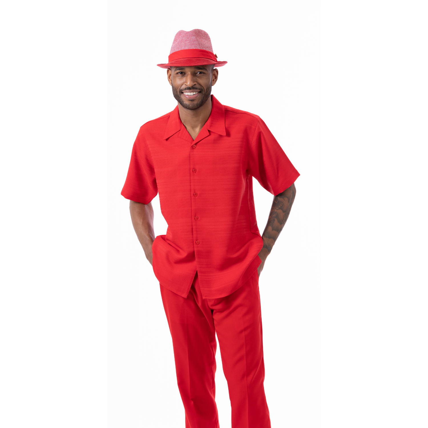 Men's 2 Piece Short Sleeve Walking Suit Tone on Tone Horizontal Stripes in Red - 2305