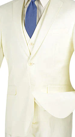 Command attention in the Formalita Collection Men's Slim Fit Vested Suit in Pristine Ivory. The single-breasted, 2-button design exudes a timeless charm, elevated by the inclusion of a matching vest. Tailored in a luxurious, Ivory hue, this suit is the epitome of elegance and sophistication.