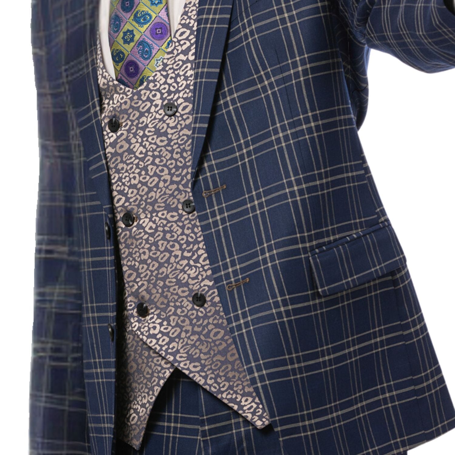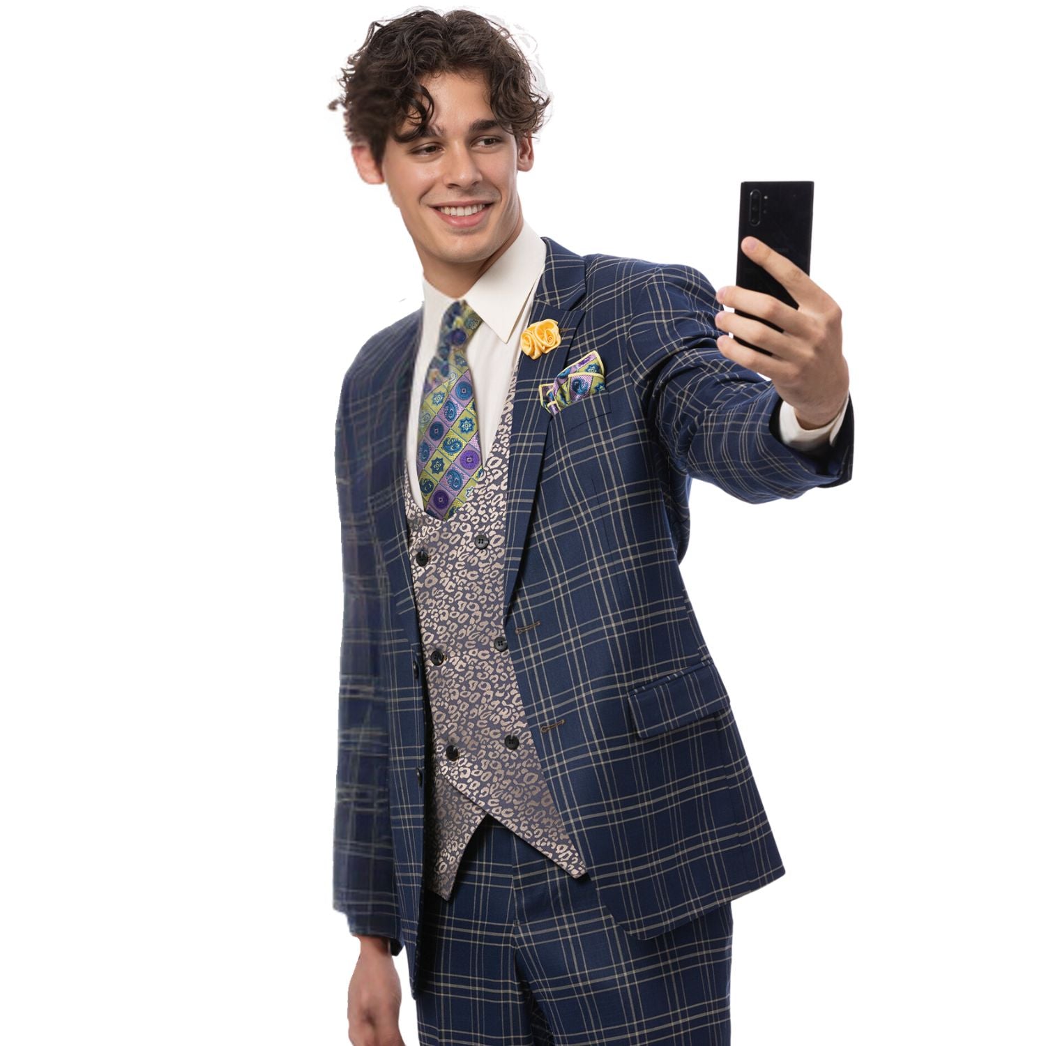 - Vest: Includes a stylish, matching patterned vest that elevates the suit’s layered look.