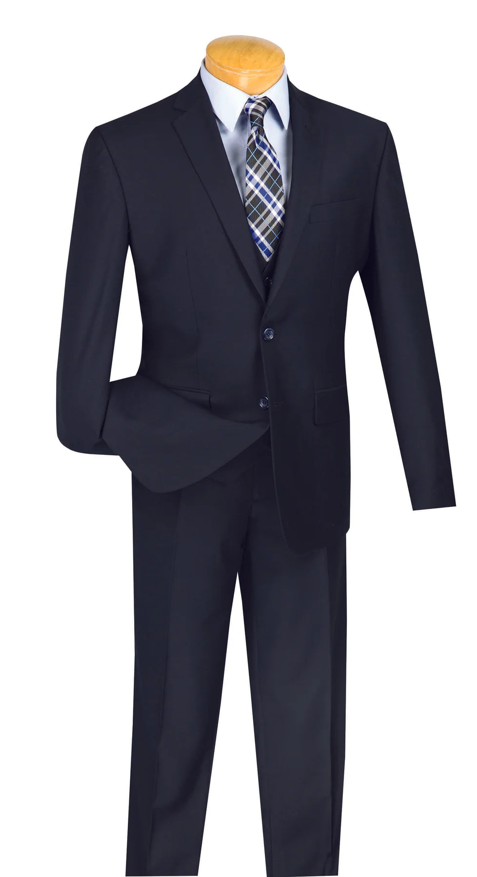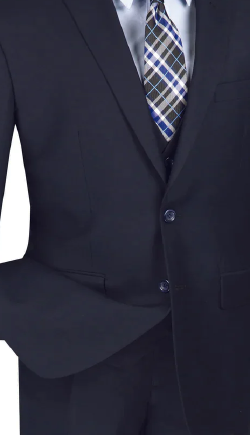 Command attention in the Formalita Collection Men's Slim Fit Vested Suit in Pristine Navy. The single-breasted, 2-button design exudes a timeless charm, elevated by the inclusion of a matching vest. Tailored in a luxurious, Navy hue, this suit is the epitome of elegance and sophistication.