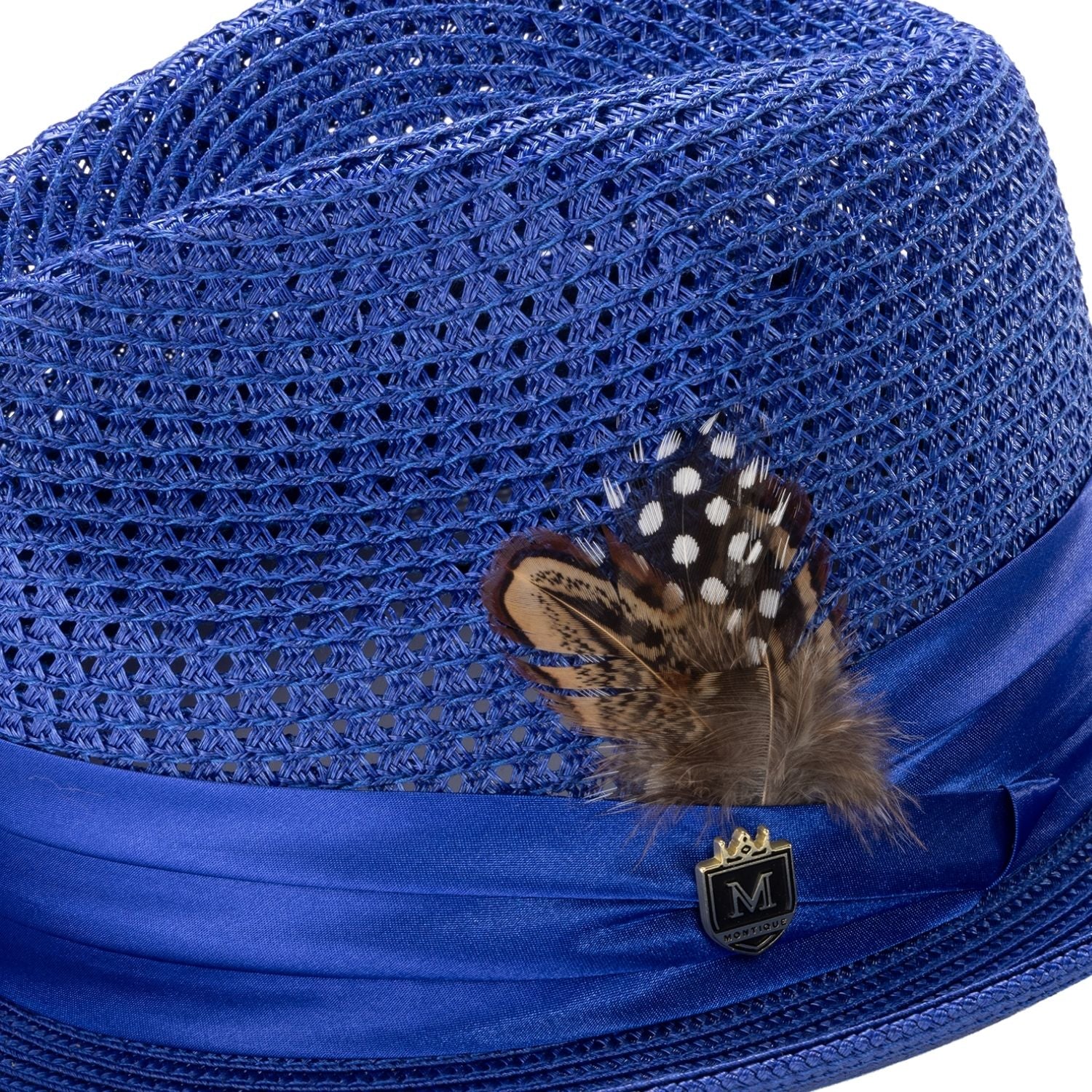 This men's royal polyester mesh fedora hat from Montique is designed for warm weather wear. The airy mesh crown allows airflow while keeping a classic fedora silhouette. Finished with a matching satin ribbon band, feather accent, and Montique pin - perfect for summer events, church, and everyday style.
