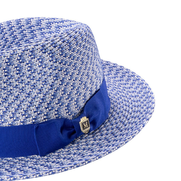 Montique’s Mensa Collection brings a bold twist to classic headwear with this Royal and white patterned fedora. The woven texture creates a unique visual depth, giving it a modern edge while maintaining timeless sophistication. A sleek Royal grosgrain ribbon with a signature Montique crest pin adds a refined finish. Whether you’re dressing up for a special occasion or adding character to an everyday outfit, this fedora delivers effortless style with a confident touch.