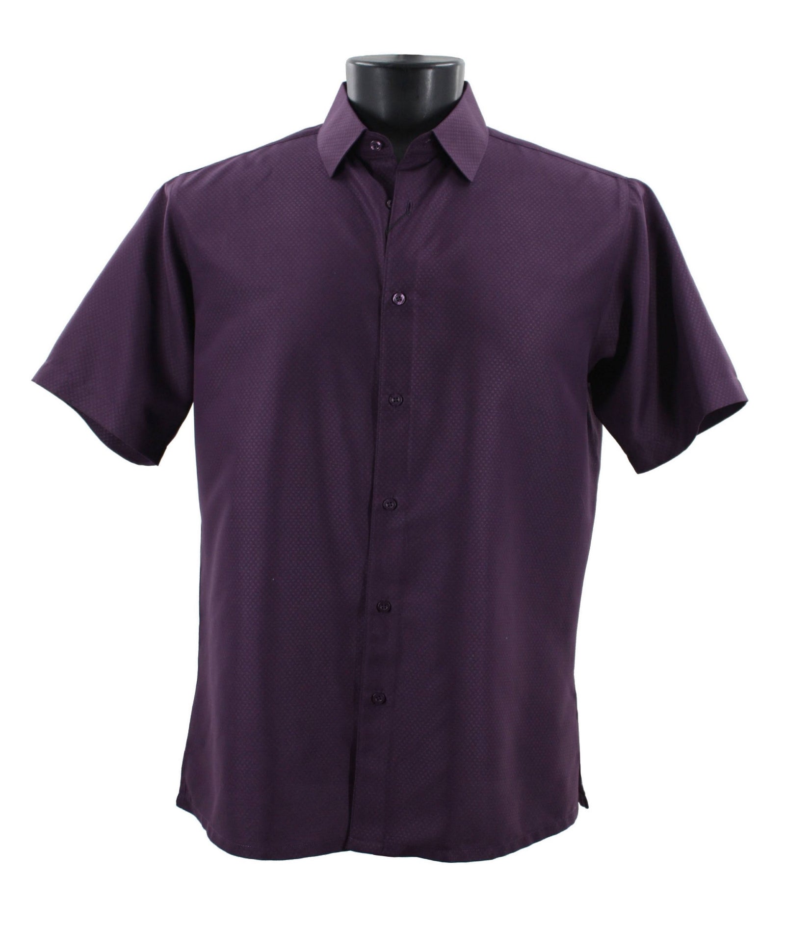 Embrace the regal touch of the MicroDot Collection's Purple Tone-on-Tone Micro-Dot Men's Short Sleeve Shirt. This shirt radiates charm with its rich purple hue and intricate micro-dot pattern, offering a distinctive style that stands out in any setting. Crafted from fine microfiber fabric, this shirt boasts a regular fit and a sleek pointed collar, making it an excellent choice for both casual gatherings and more formal events.