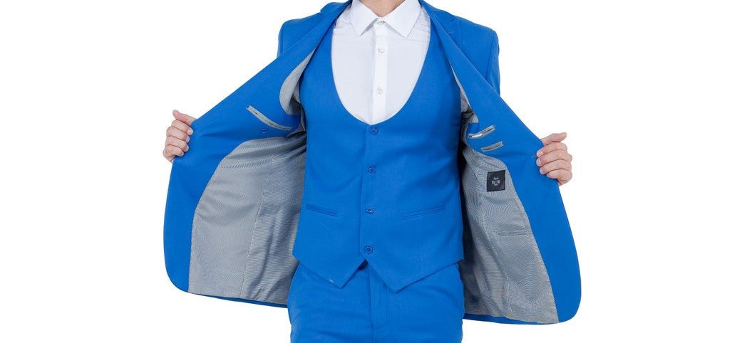 The Midas Collection Three-Piece Suit in blue offers a classic look with a modern twist. Perfect for any formal occasion, this suit's rich hue and ultra-slim fit provide a timeless yet contemporary appeal.