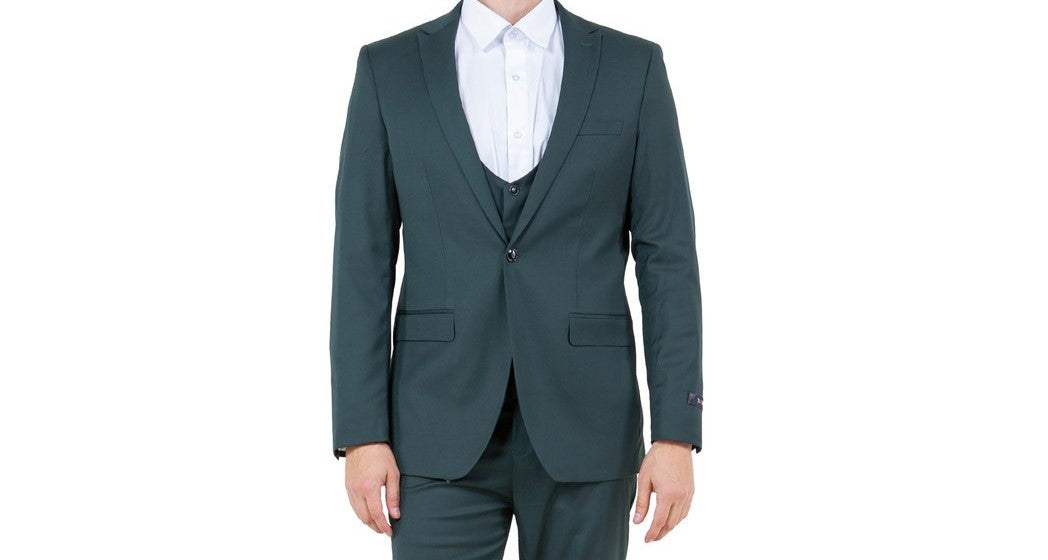 Make a unique style statement with the Midas Collection Three-Piece Suit in hunter green. This deep, rich color adds a touch of luxury to your ensemble, ideal for making a lasting impression at any event.