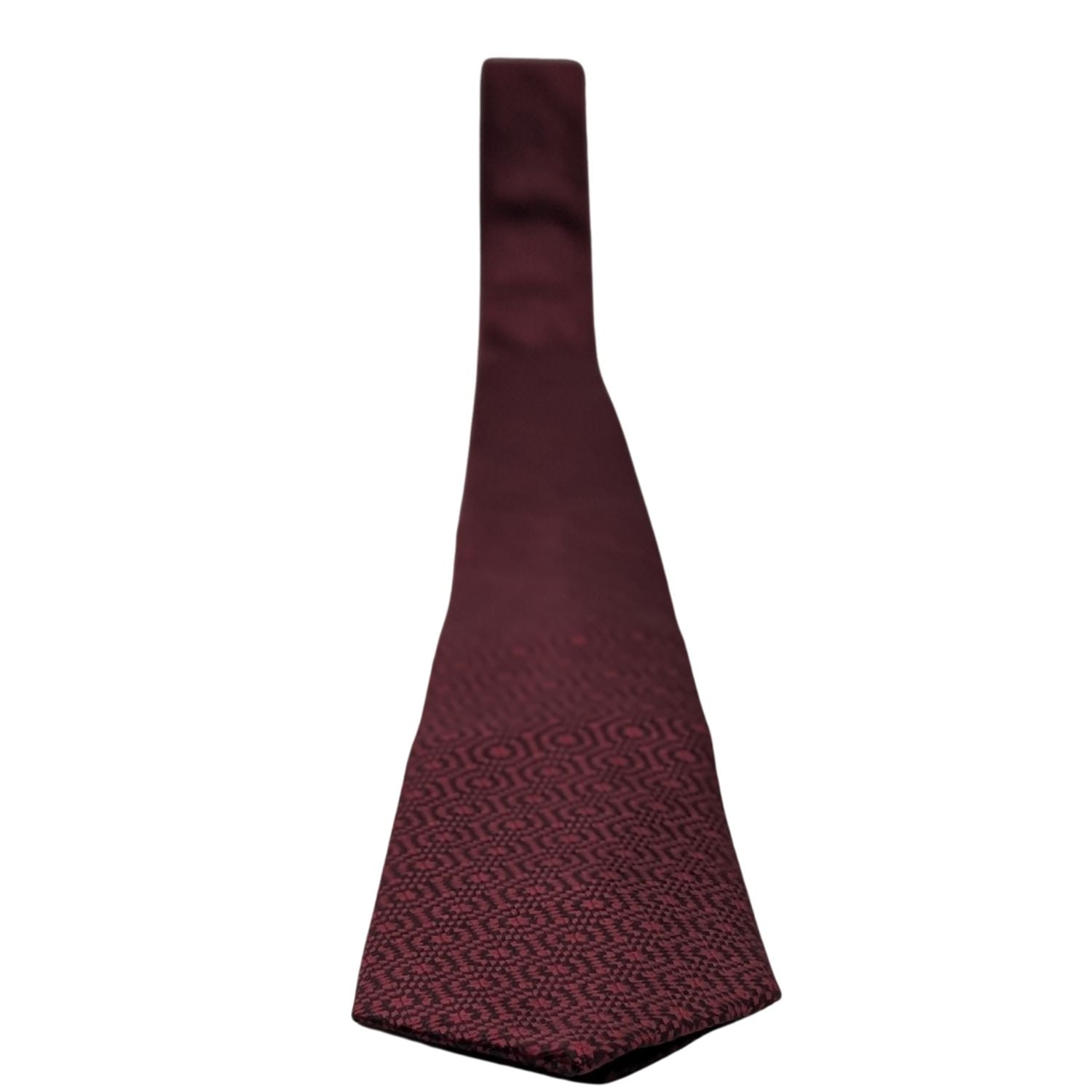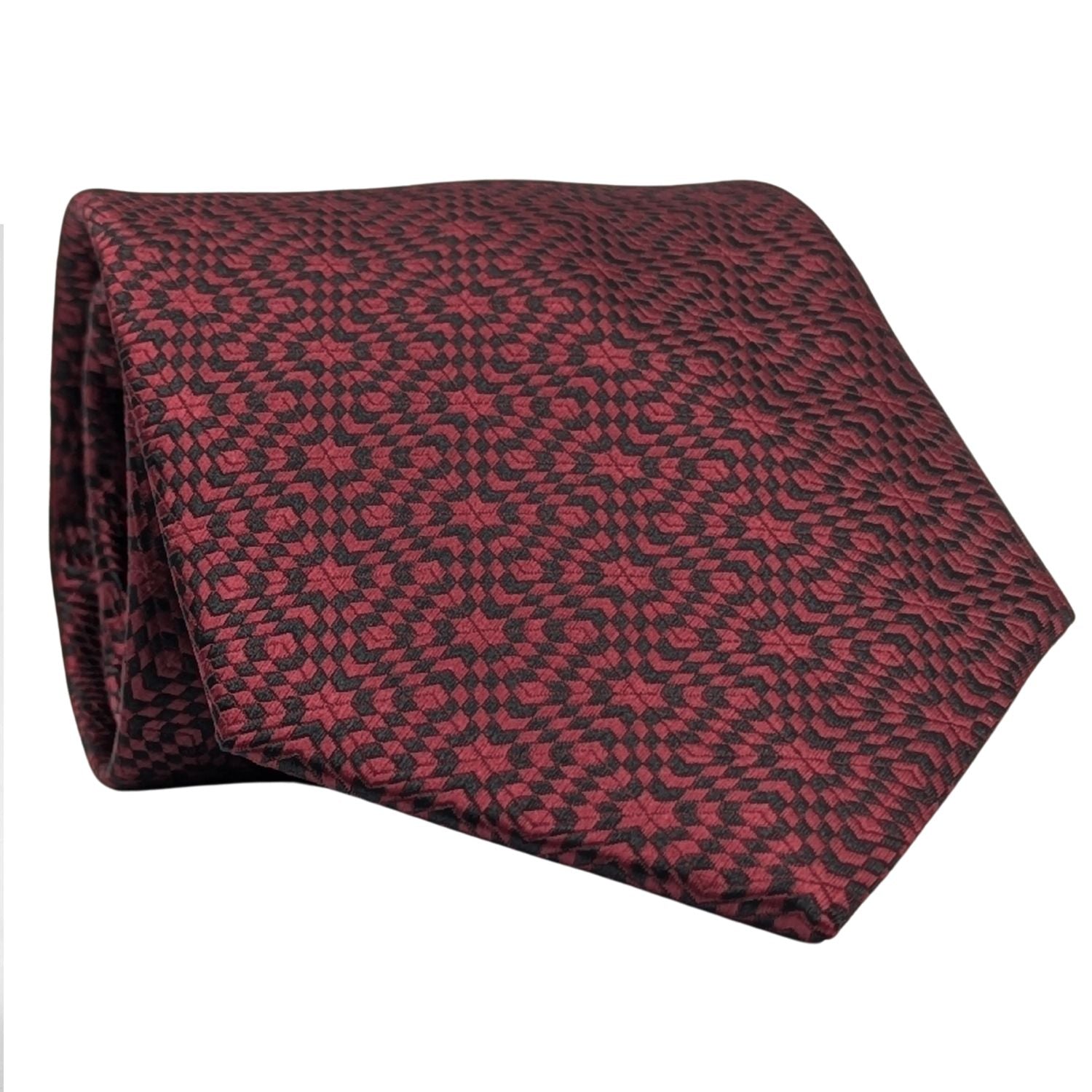 Step into a visual illusion with the Mirage Collection's Crimson Illusion Tie. This exquisite tie captivates with a complex, tessellated pattern, reminiscent of a mirage's shifting allure. Woven with precision from 1200 needle refined polyester, it features an enigmatic pattern that intertwines shades of deep crimson with subtle black accents, creating a dynamic, three-dimensional appearance. providing a flawless knot and an impeccable drape suitable for any wardrobe and occasion.