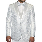 - White brocade jacket with a satin peak lapel for a polished finish.