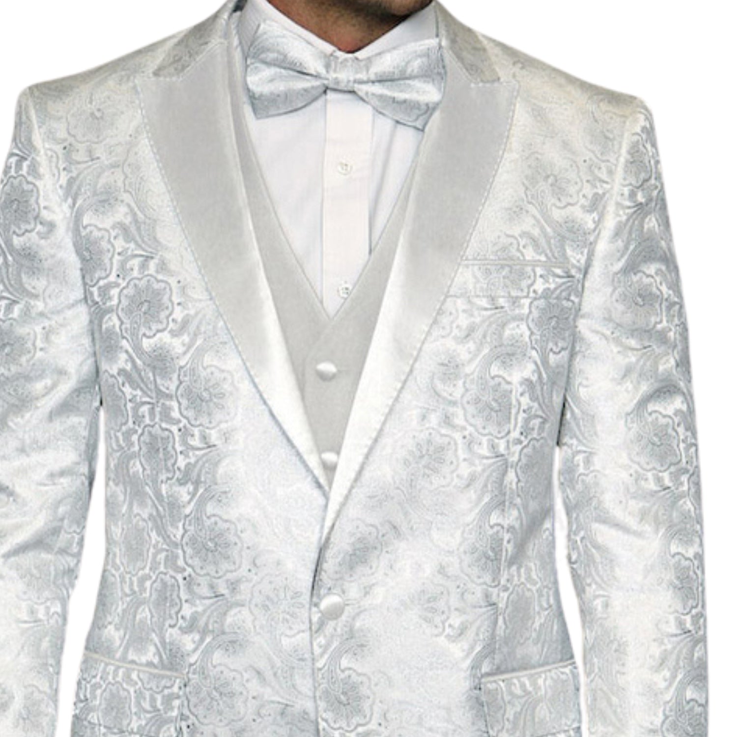 Refined elegance meets modern sophistication with the Mirthmere Collection 3-Piece White Tuxedo. Designed for distinguished style, this ensemble features an intricate brocade jacket with a luxurious satin peak lapel, a coordinating vest, and flat-front white pants. Complete with a matching bow tie, this tuxedo is the perfect choice for weddings, galas, and formal occasions that demand a timeless look.
