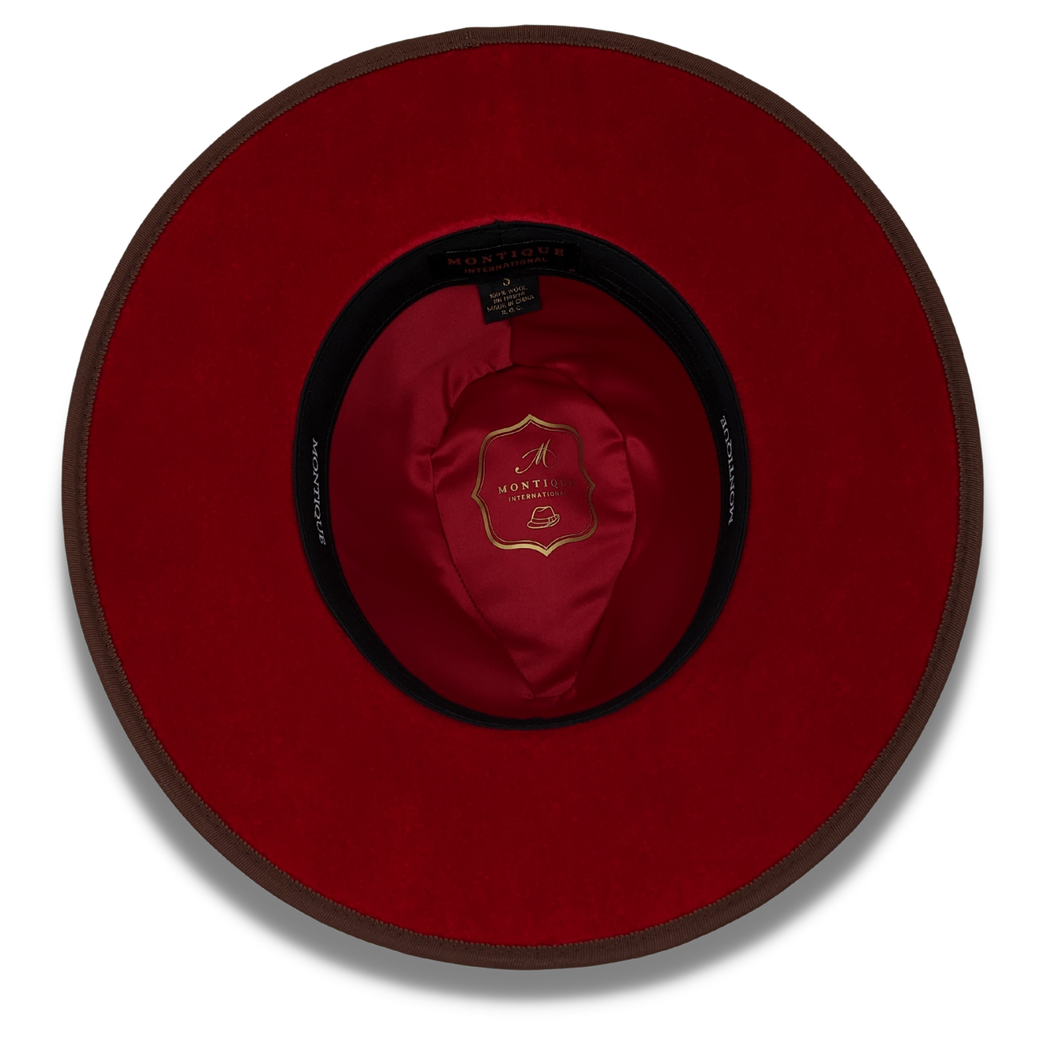 Elevate your style with the Montique Brown 3 1/8" Brim Red Bottom Wool Felt Dress Hat from our Modernique Collection. This exquisite hat, crafted with a Matching Grossgrain Band adorned with a montique pin, features a distinctive pinch crown for added elegance. The hat’s solid color brim measures 3 1/8" inches, offering a sleek contrast to the red bottom.