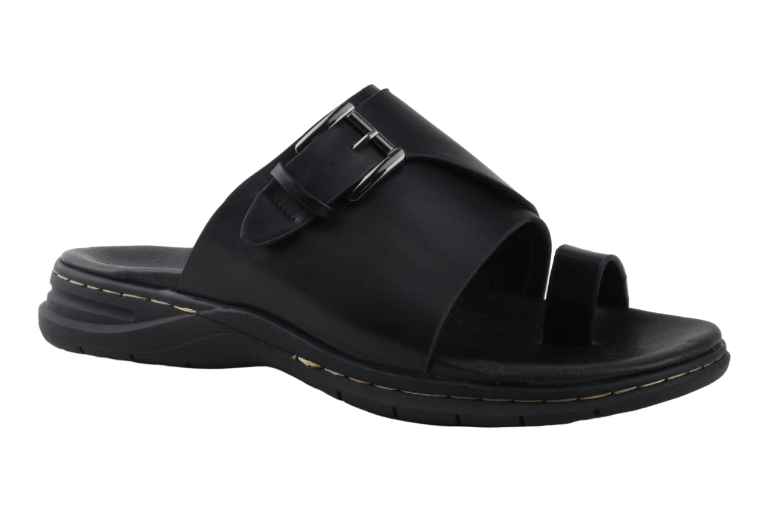 Simple. Functional. Effortlessly refined. The Montiero Collection brings together comfort and craftsmanship in this toe loop sandal. Made with a smooth synthetic leather upper, this open-toe slide features a wide strap with a working brass-tone buckle for an adjustable fit and visual interest. The soft toe loop adds stability, while the cushioned footbed and durable black outsole provide all-day comfort and support.