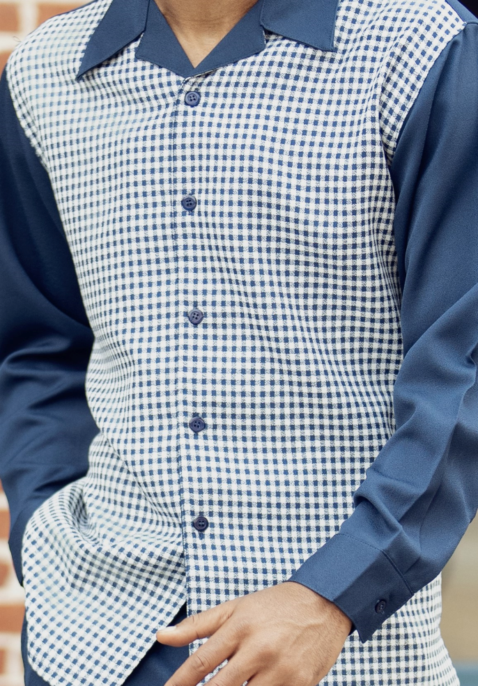 Introducing our Blotchy Collection's 2-Piece Checkered Walking Suit, a perfect blend of style and comfort for the modern man. This ensemble features a sleek navy checkered shirt and matching navy pants, with an additional option to purchase the matching hat and shoes separately.