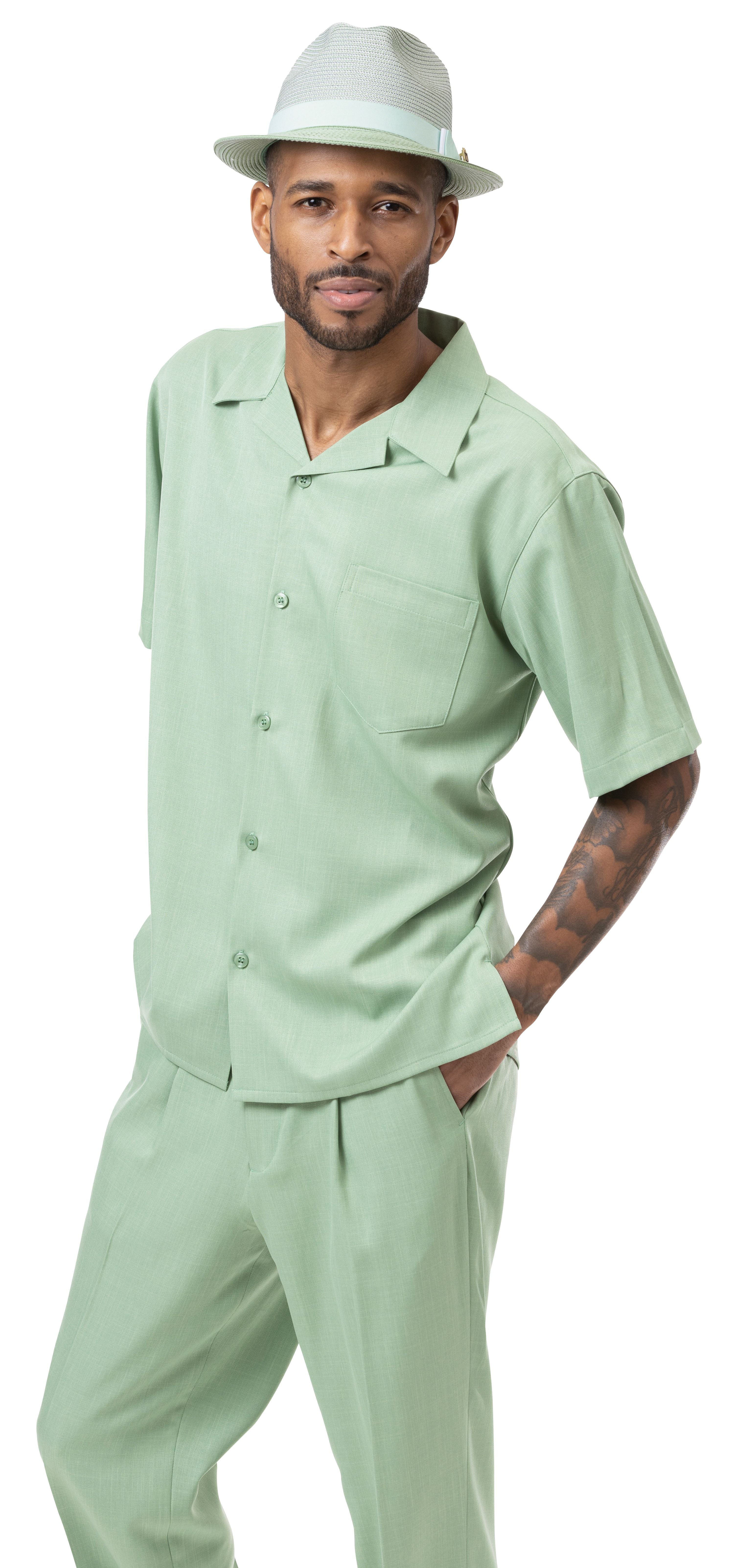 - Two-piece walking suit set with a short-sleeve shirt and single-pleat pants