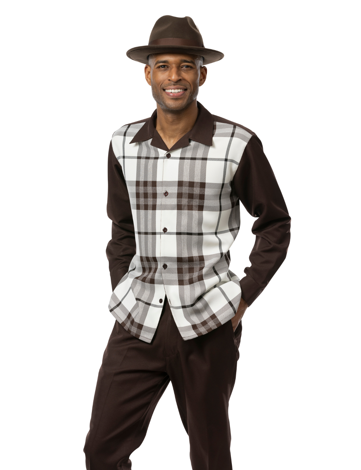 Endowment Collection: Brown Plaid 2 Piece Long Sleeve Walking Suit Set 2355