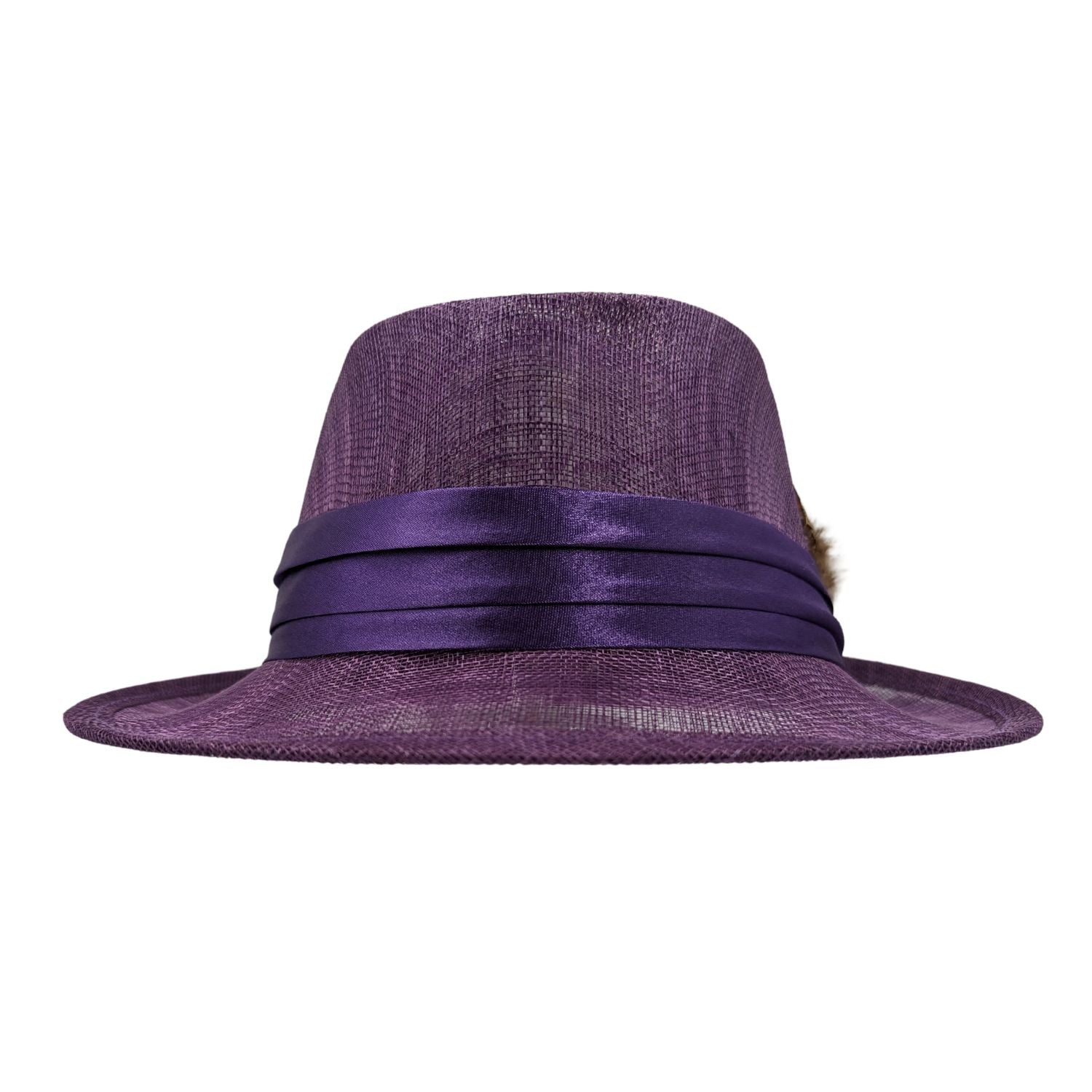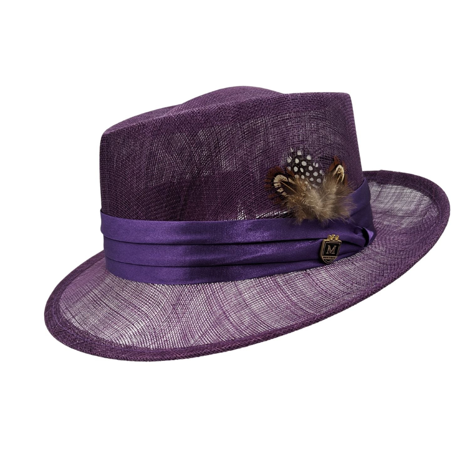 Introducing the Grape Sinamay Fedora Hat from Montique Style H-19. This exquisite hat features a rich grape hue crafted from high-quality sinamay, ensuring both durability and a lightweight feel. Adorned with a sleek satin ribbon band and a tasteful feather accent, this fedora is the epitome of style. The distinctive Montique pin adds an exclusive touch, making this wide brim fedora not just a hat, but a statement piece. Perfect for outdoor events, sophisticated gatherings, or adding an elegant touch to any casual outfit.