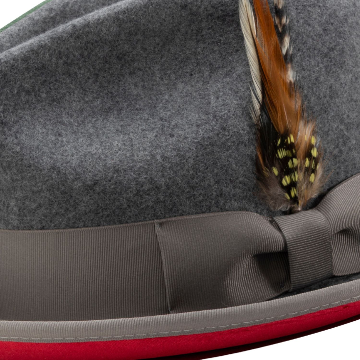Enhance your style with the Ambley Collection Montique Grey Two-Tone Wool Felt Fedora Hat. Crafted with premium wool felt, this hat features a 2 3/8" brim adorned with a striking red bottom. The matching grosgrain ribbon and feather accent add a touch of elegance. Ideal for adding flair to any outfit, whether it's a casual day out or a special occasion.