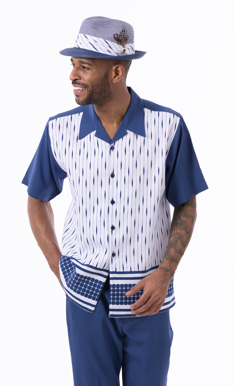 Montique Navy Vertical Pattern With Design Walking Suit 2 Piece SHORTS SET 72303