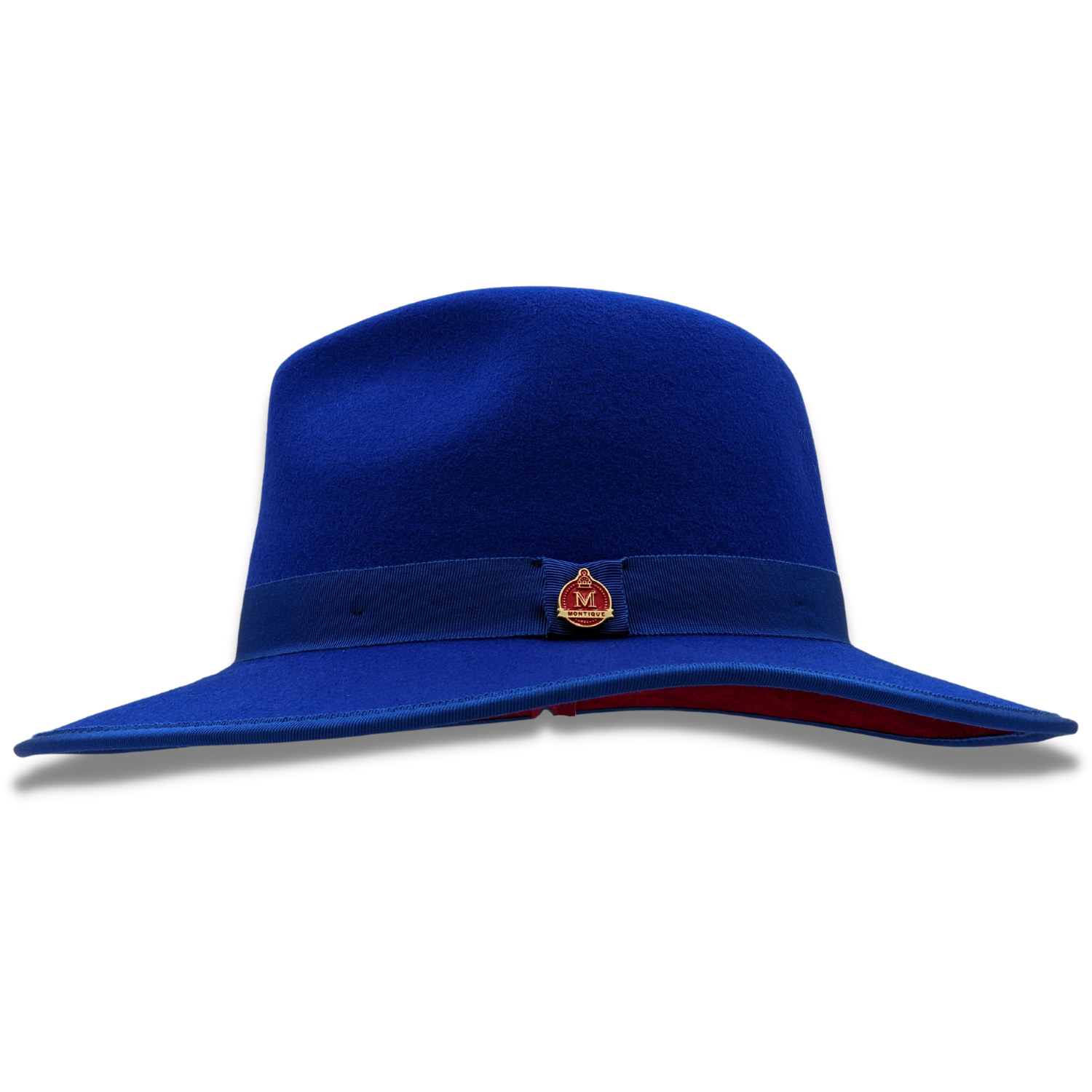 Elevate your style with the Montique Royal 3 1/8" Brim Red Bottom Wool Felt Dress Hat from our Modernique Collection. This exquisite hat, crafted with a Matching Grossgrain Band adorned with a montique pin, features a distinctive pinch crown for added elegance. The hat’s solid color brim measures 3 1/8" inches, offering a sleek contrast to the red bottom.