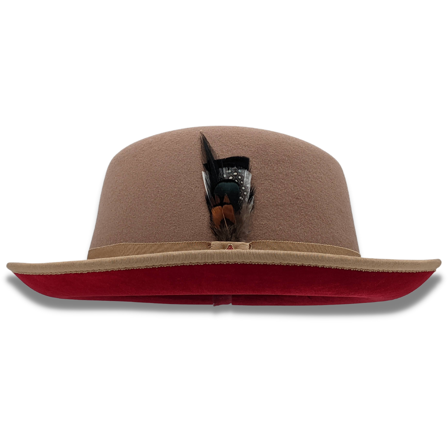 Groovify Collection: Montique Tan 2 3/4" Brim Red Bottom Wool Felt Dress Hat