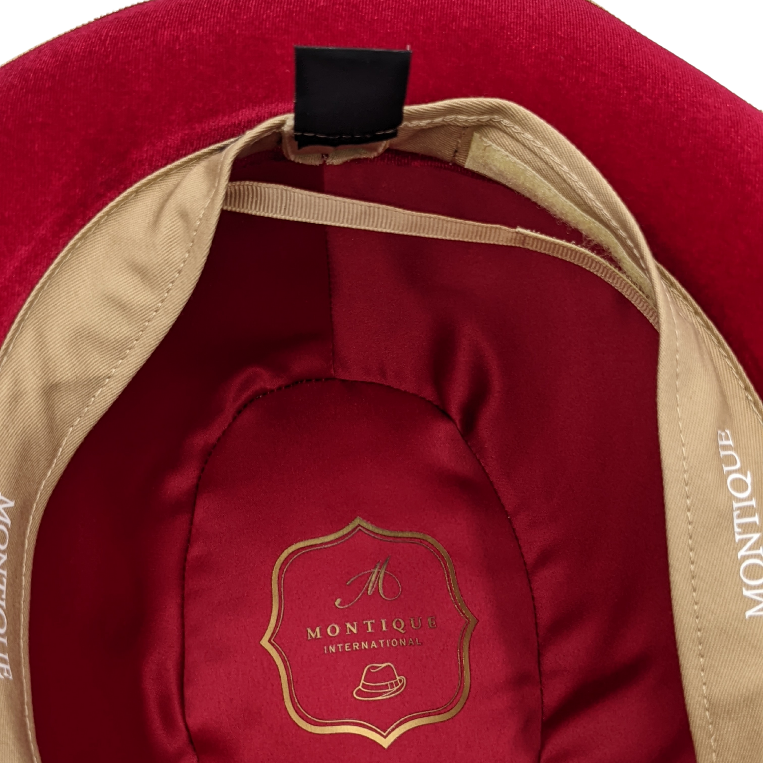The hat comes equipped with a luxurious lining, ensuring a comfortable fit throughout the day. It also features a Velcro size adjuster for a perfect fit, accommodating various head sizes with ease. Embellished with a signature Montique pin and a tasteful feather accent, this hat is the epitome of sophistication and flair.