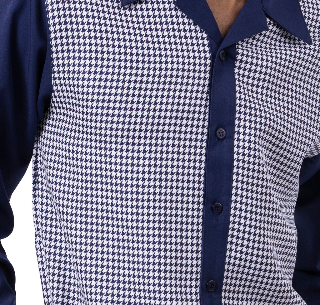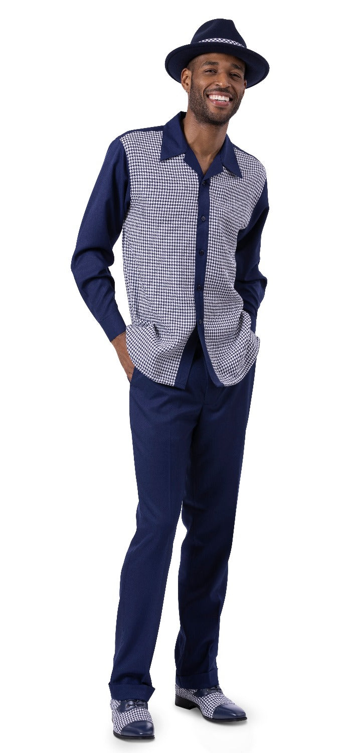 Montique Navy Houndstooth Design 2 Piece Long Sleeve Walking Suit Set 2255